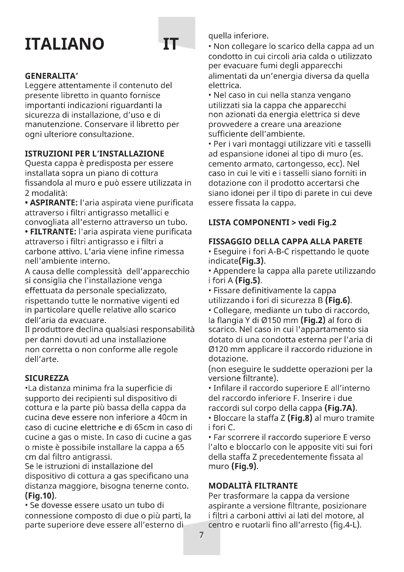 - Far scorrere il raccordo superiore E verso l’alto e bloccarlo con le apposite viti sui fori della staffa Z precedentemente ssata al muro (Fig.9). MODALITÀ FILTRANTE Per trasformare la cappa da versione aspirante a versione ltrante, posizionare i ltri a carboni attivi ai lati del motore, al centro e ruotarli no all’arresto (g.4-L). IT8 CONNESSIONE ELETTRICA Vericare che il voltaggio della rete sia suciente e conforme ai dati relativi all’alimentazione della cappa indicati nella targhetta all’interno dell’apparecchio. CONTROLLO FUNZIONALE Vericare l’accensione del motore nelle 3 velocita’ e l’illuminazione.