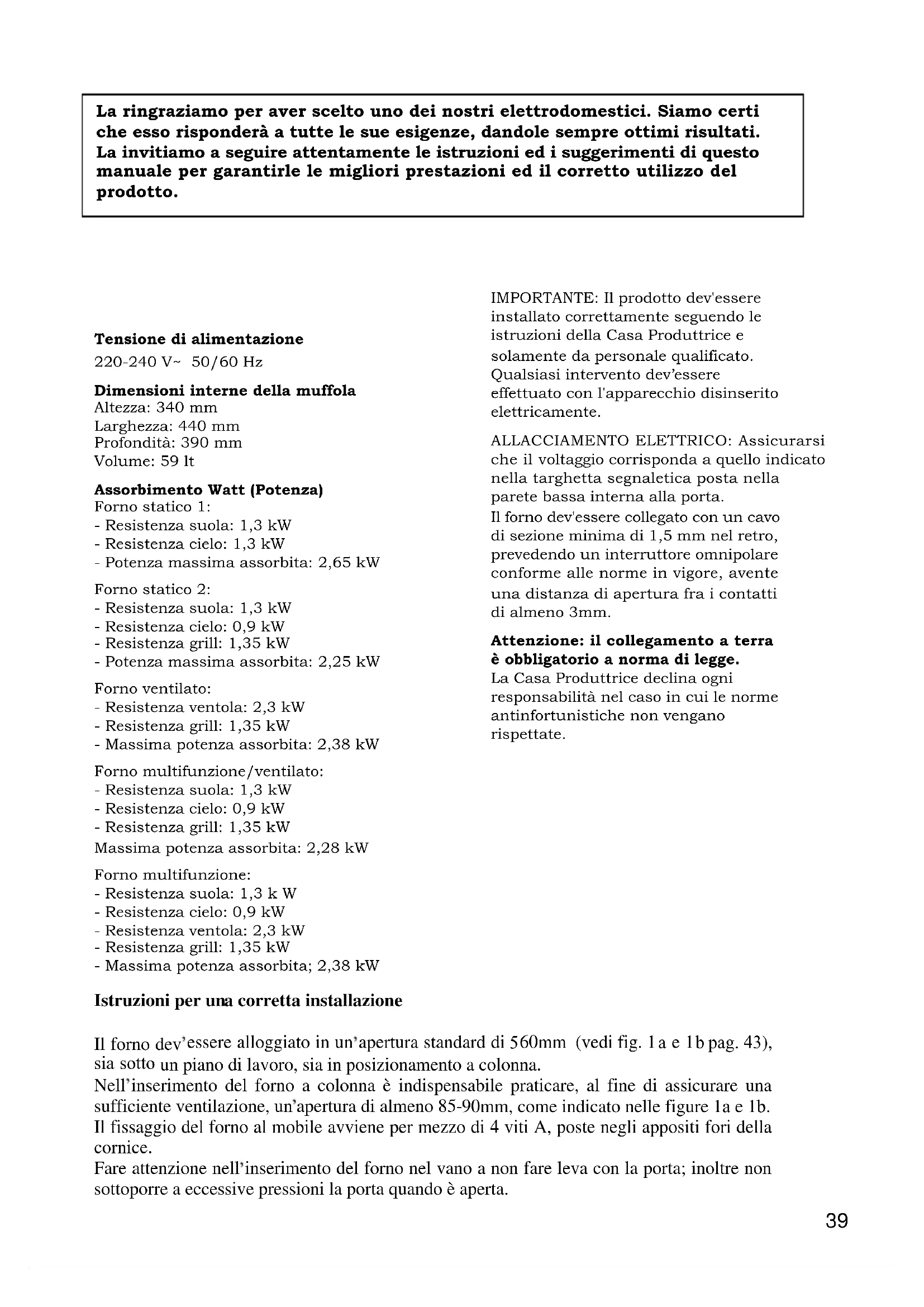 Do not use a steam cleaner with this appliance. Do not use harsh abrasive cleaners or sharp metal scrapers to clean the oven door glass since they can scratch the surface, which may result in shattering of the glass.Indice Istruzioni per l'utente 39-42 Istruzioni per l’installazione 42-45 Cruscotto comandi 46 Funzioni del selettore 47-48 Tabella cottura 49 Uso del grill 50 Uso del girarrosto 50 Contaminuti meccanico 60’ 51 Fine cottura meccanico 120’ 51 Programmatore analogico 52 Orologio analogico 52 Programmatore elettronico 53-65 Sostituzione della lampada del forno 66 Smontaggio della porta 66 Smontaggio del vetro interno della porta 67-68 Smontaggio della porta a libro 69-70 Optional su richiesta 71 Pulizia e manutenzione del forno 72 3738La ringraziamo per aver scelto uno dei nostri elettrodomestici. Siamo certi che esso risponderà a tutte le sue esigenze, dandole sempre ottimi risultati. La invitiamo a seguire attentamente le istruzioni ed i suggerimenti di questo manuale per garantirle le migliori prestazioni ed il corretto utilizzo del prodotto. Tensione di alimentazione 220-240 V~ 50/60 Hz Dimensioni interne della muffolaAltezza: 340 mm Larghezza: 440 mm Profondità: 390 mm Volume: 59 ltAssorbimento Watt (Potenza)Forno statico 1:- Resistenza suola: 1,3 kW- Resistenza cielo: 1,3 kW- Potenza massima assorbita: 2,65 kWForno statico 2:- Resistenza suola: 1,3 kW- Resistenza cielo: 0,9 kW- Resistenza grill: 1,35 kW- Potenza massima assorbita: 2,25 kWForno ventilato:- Resistenza ventola: 2,3 kW- Resistenza grill: 1,35 kW- Massima potenza assorbita: 2,38 kWForno multifunzione/ventilato:- Resistenza suola: 1,3 kW- Resistenza cielo: 0,9 kW- Resistenza grill: 1,35 kWMassima potenza assorbita: 2,28 kWForno multifunzione:- Resistenza suola: 1,3 k W- Resistenza cielo: 0,9 kW- Resistenza ventola: 2,3 kW- Resistenza grill: 1,35 kW- Massima potenza assorbita; 2,38 kWIMPORTANTE: Il prodotto dev'essereinstallato correttamente seguendo leistruzioni della Casa Produttrice esolamente da personale qualificato.Qualsiasi intervento dev’essereeffettuato con l'apparecchio disinseritoelettricamente.ALLACCIAMENTO ELETTRICO: Assicurarsiche il voltaggio corrisponda a quello indicatonella targhetta segnaletica posta nellaparete bassa interna alla porta. Il forno dev'essere collegato con un cavodi sezione minima di 1,5 mm nel retro,prevedendo un interruttore omnipolareconforme alle norme in vigore, aventeuna distanza di apertura fra i contattidi almeno 3mm.Attenzione: il collegamento a terraè obbligatorio a norma di legge. La Casa Produttrice declina ogni responsabilità nel caso in cui le normeantinfortunistiche non venganorispettate.