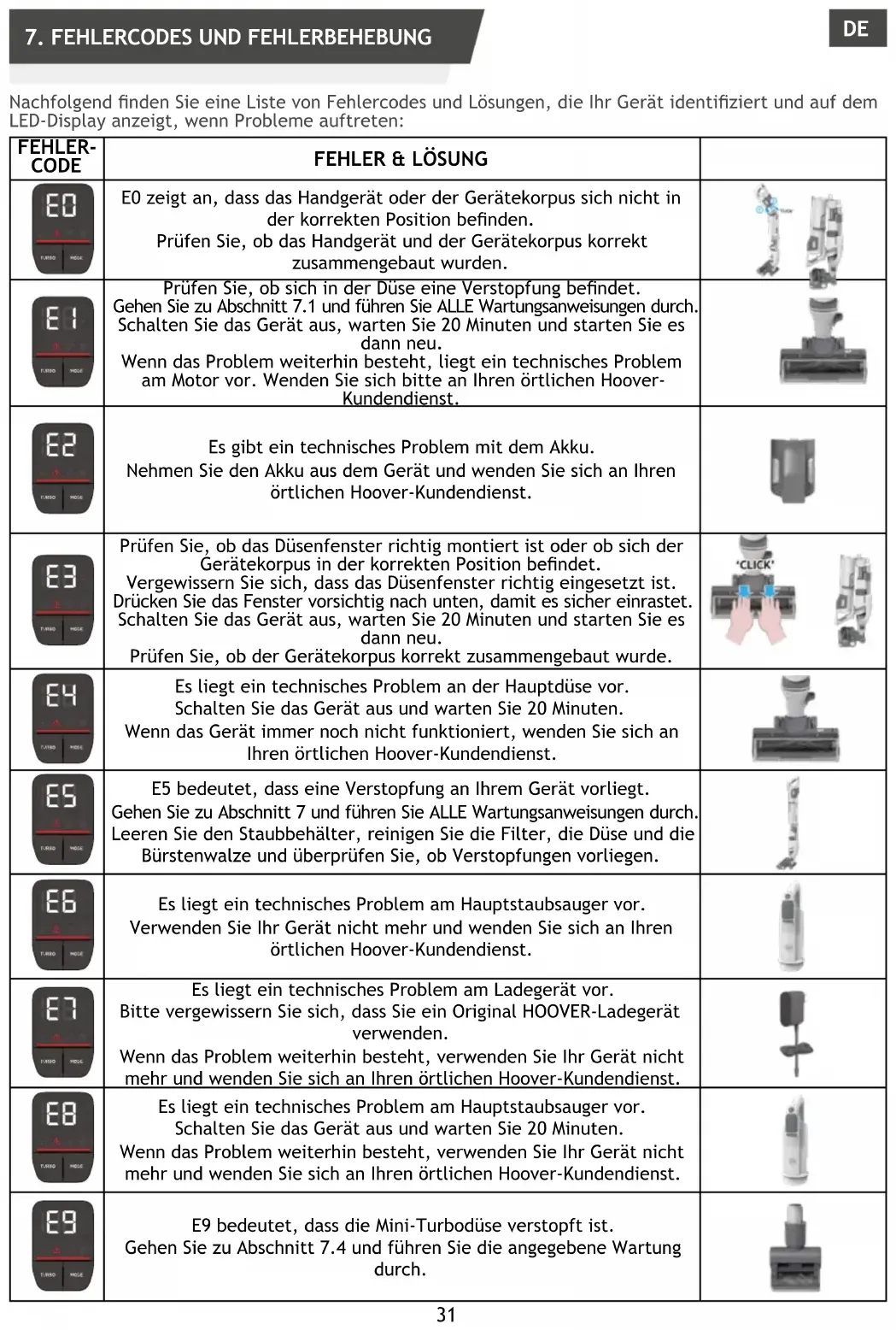 E0 indica che l’unità portatile o il corpo principale non sono nella posizione corretta. Controllare se l’unità portatile e il corpo principale sono montati correttamente. Vericare se ci sono ostruzioni nella spazzola. Controllare la sezione 7.1 e seguire TUTTI i requisiti di manutenzione. Spegnere l’apparecchio e attendere 20 minuti, poi riaccenderlo. Se il problema persiste, c’è un problema tecnico al motore: contattare il servizio clienti Hoover più vicino. C’é un problema tecnico nella batteria. Rimuovere la batteria dall’apparecchio e contattare il centro assistenza Hoover più vicino. Controllare se lo sportellino della spazzola è montato correttamente o se il corpo principale è nella giusta posizione. Assicurarsi che lo sportellino della spazzola sia posizionato correttamente. Premere delicatamente lo sportellino verso il basso per agganciarlo in sicurezza. Spegnere l’apparecchio e attendere 20 minuti, poi riaccenderlo. Controllare che il corpo principale sia montato correttamente. C’é un problema tecnico sulla spazzola principale. Spegnere l’apparecchio e attendere 20 minuti. Se l’apparecchio continua a non funzionare, contattare il centro assistenza Hoover più vicino. E5 indica che c’è un blocco nell’apparecchio. Controllare la sezione 7 e seguire TUTTI i requisiti di manutenzione. Svuotare il contenitore raccoglipolvere, pulire i ltri, pulire la spazzola e il rullo e vericare se ci sono ostruzioni. C’é un problema tecnico sull’aspirapolvere principale. Interrompere l’uso dell’apparecchio e contattare il servizio clienti Hoover più vicino. C’é un problema tecnico sul caricatore. Assicurarsi di usare un caricatore HOOVER originale. Se il problema persiste, interrompere l’uso dell’apparecchio e contattare il centro assistenza Hoover più vicino. C’é un problema tecnico sull’aspirapolvere principale. Spegnere l’apparecchio e attendere 20 minuti. Se il problema persiste, interrompere l’uso dell’apparecchio e contattare il centro assistenza Hoover più vicino. E9 indica che la mini turbospazzola è ostruita. Controllare la sezione 7.4 e seguire le indicazioni per la manutenzione. ITA