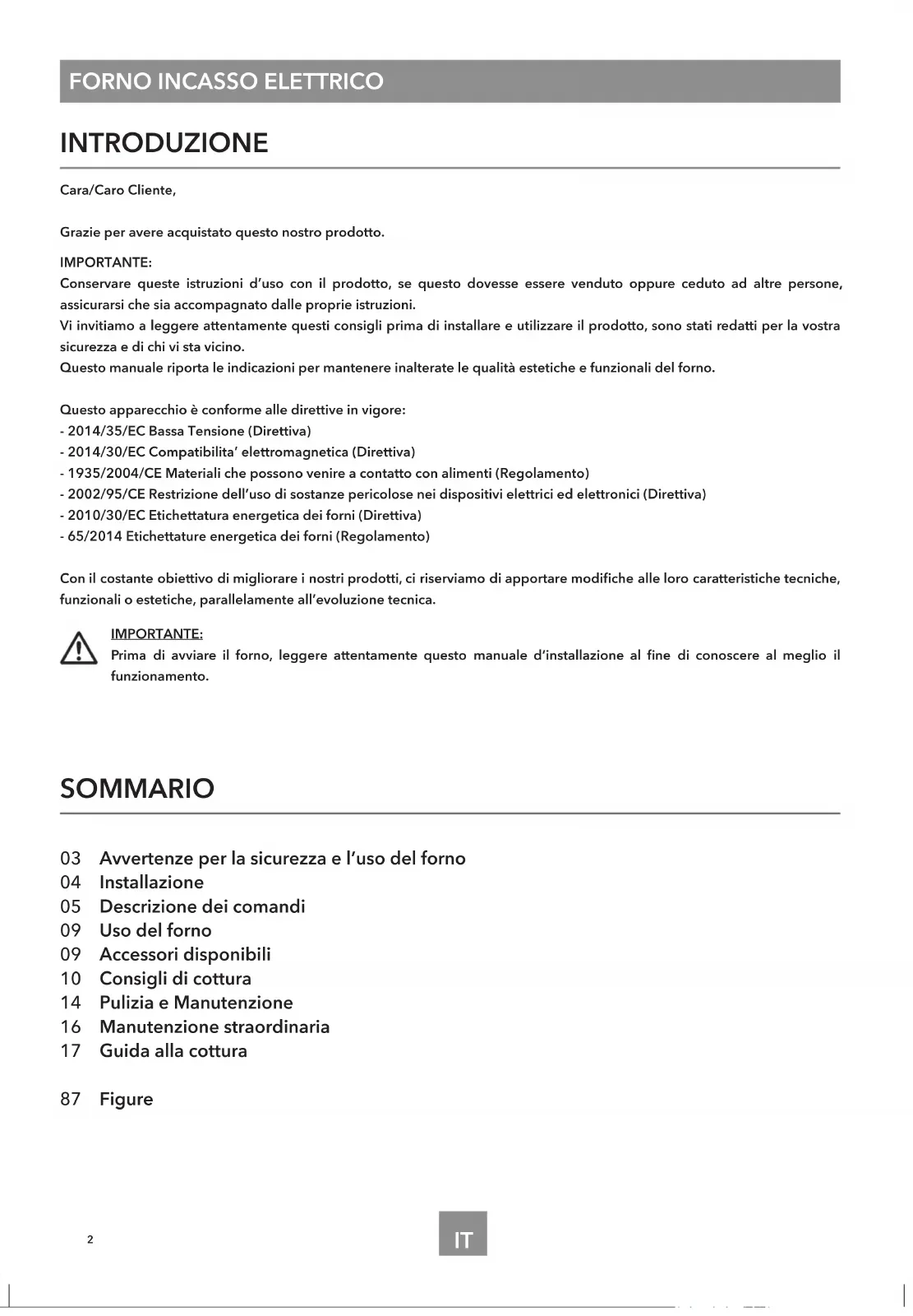 SOMMARIO 03 Avvertenze per la sicurezza e l’uso del forno 04 Installazione 05 Descrizione dei comandi 09 Uso del forno 09 Accessori disponibili 10 Consigli di cottura 14 Pulizia e Manutenzione 16 Manutenzione straordinaria 17 Guida alla cottura 87 Figure INTRODUZIONE Cara/Caro Cliente, Grazie per avere acquistato questo nostro prodotto. IMPORTANTE: Conservare queste istruzioni d’uso con il prodotto, se questo dovesse essere venduto oppure ceduto ad altre persone, assicurarsi che sia accompagnato dalle proprie istruzioni. Vi invitiamo a leggere attentamente questi consigli prima di installare e utilizzare il prodotto, sono stati redatti per la vostra sicurezza e di chi vi sta vicino. Questo manuale riporta le indicazioni per mantenere inalterate le qualità estetiche e funzionali del forno. Questo apparecchio è conforme alle direttive in vigore: - 2014/35/EC Bassa Tensione (Direttiva) - 2014/30/EC Compatibilita’ elettromagnetica (Direttiva) - 1935/2004/CE Materiali che possono venire a contatto con alimenti (Regolamento) - 2002/95/CE Restrizione dell’uso di sostanze pericolose nei dispositivi elettrici ed elettronici (Direttiva) - 2010/30/EC Etichettatura energetica dei forni (Direttiva) - 65/2014 Etichettature energetica dei forni (Regolamento) Con il costante obiettivo di migliorare i nostri prodotti, ci riserviamo di apportare modiche alle loro caratteristiche tecniche, funzionali o estetiche, parallelamente all’evoluzione tecnica. IMPORTANTE: Prima di avviare il forno, leggere attentamente questo manuale d’installazione al ne di conoscere al meglio il funzionamento.