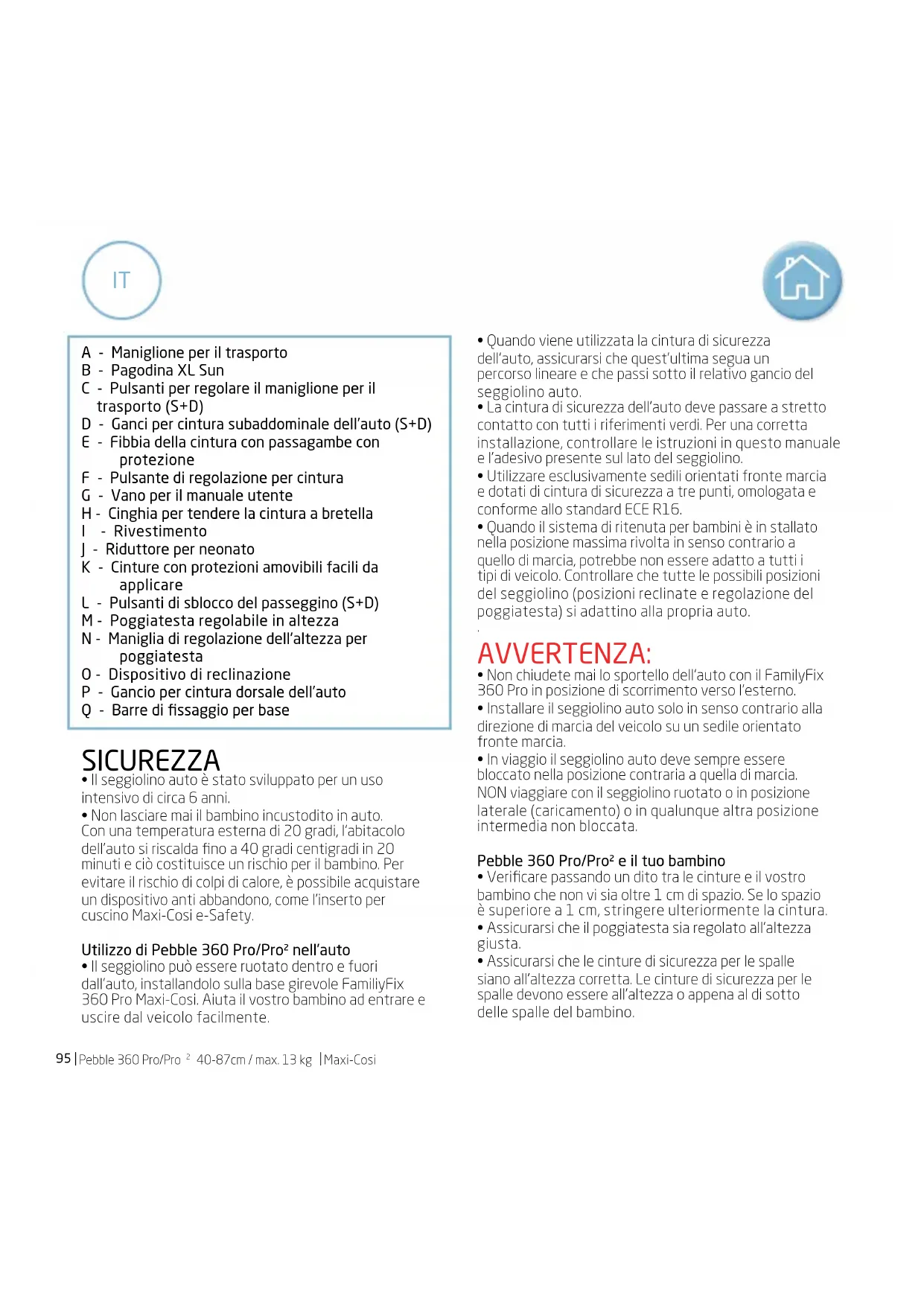 Il Pebble 360 Pro/Pro² è un Sistema di Ritenuta Universale con Cintura Potenziata. È conforme al regolamento UN No. 129 i-Size, per essere utilizzato principalmente nelle “Posizioni universali sedute” come indicato dai produttori del veicolo nel foglietto illustrativo. In caso di dubbi, consultare il Sistema di Ritenuta Universale del produttore o del venditore. Questo seggiolino per bambino fa parte della Famiglia 360 Pro e ore una soluzione mobile onnicomprensiva dalla nascita fino ai 4 anni circa. Per maggiori informazioni su i-Size, collegarsi al sito www.maxi-cosi.com Categoria del tuo seggiolino auto: i-Size (40 - 87 cm – fino a 18 mesi circa) Posizione del tuo seggiolino auto: in senso contrario di marcia