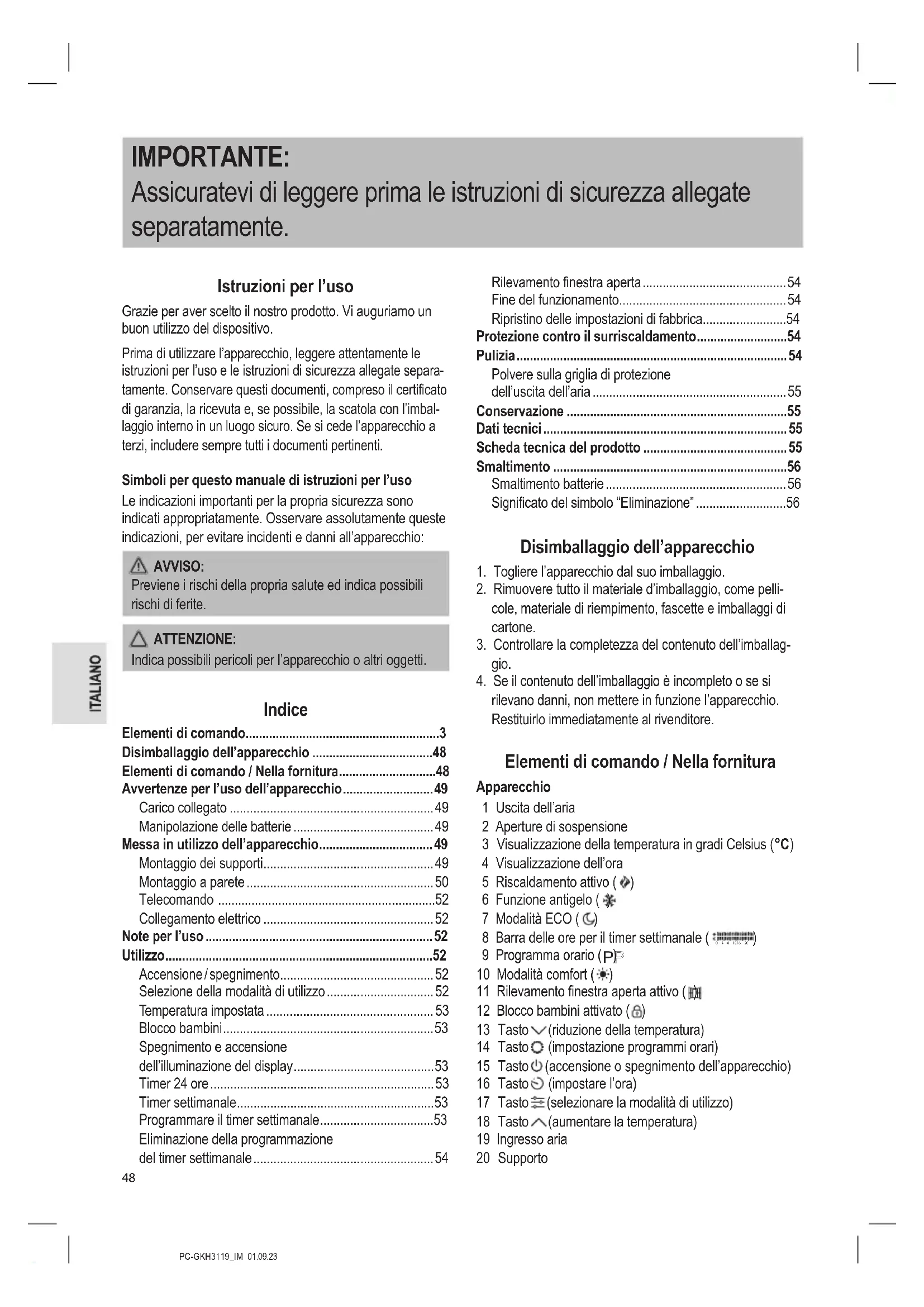 13 Tasto (riduzione della temperatura) 14 Tasto (impostazione programmi orari) 15 Tasto (accensione o spegnimento dell’apparecchio) 16 Tasto (impostare l’ora) 17 Tasto (selezionare la modalità di utilizzo) 18 Tasto (aumentare la temperatura) 19 Ingresso aria 20 SupportoPC-GKH3119_IM 01.09.23