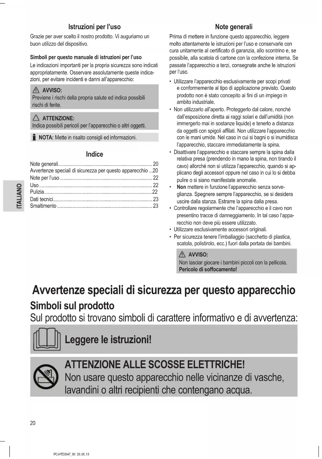- Per sicurezza tenere l’imballaggio (sacchetto di plastica, scatola, polistirolo, ecc.) fuori dalla portata dei bambini. AVVISO: Non lasciar giocare i bambini piccoli con la pellicola. Pericolo di soffocamento! Avvertenze speciali di sicurezza per questo apparecchio Simboli sul prodotto Sul prodotto si trovano simboli di carattere informativo e di avvertenza: Leggere le istruzioni! ATTENZIONE ALLE SCOSSE ELETTRICHE! Non usare questo apparecchio nelle vicinanze di vasche, lavandini o altri recipienti che contengano acqua.21 PC-HTD3047_IM 26.06.19 AVVISO: