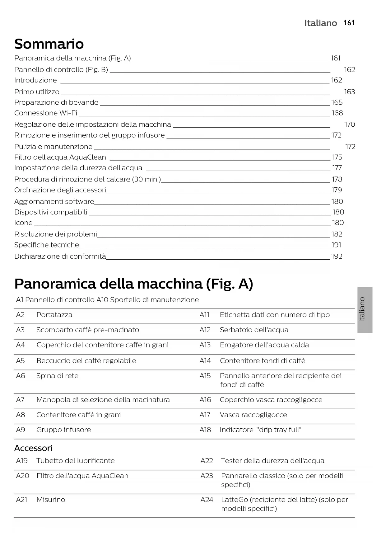 Italiano Italiano Sommario Panoramica della macchina (Fig. A) _________________________________________________________________ 161 Pannello di controllo (Fig. B) _________________________________________________________________________ 162 Introduzione _________________________________________________________________________________________ 162 Primo utilizzo _________________________________________________________________________________________ 163 Preparazione di bevande ____________________________________________________________________________ 165 Connessione Wi-Fi ___________________________________________________________________________________ 168 Regolazione delle impostazioni della macchina ____________________________________________________ 170 Rimozione e inserimento del gruppo infusore ______________________________________________________ 172 Pulizia e manutenzione ______________________________________________________________________________ 172 Filtro dell'acqua AquaClean _________________________________________________________________________ 175 Impostazione della durezza dell'acqua _____________________________________________________________ 177 Procedura di rimozione del calcare (30 min.)________________________________________________________ 178 Ordinazione degli accessori__________________________________________________________________________ 179 Aggiornamenti software______________________________________________________________________________ 180 Dispositivi compatibili ________________________________________________________________________________ 180 Icone __________________________________________________________________________________________________ 180 Risoluzione dei problemi_____________________________________________________________________________ 182 Specifiche tecniche___________________________________________________________________________________ 191 Dichiarazione di conformità__________________________________________________________________________ 192 Panoramica della macchina (Fig. A) A1 Pannello di controllo A10 Sportello di manutenzione A2 Portatazza A11 Etichetta dati con numero di tipo A3 Scomparto caffè pre-macinato A12 Serbatoio dell'acqua A4 Coperchio del contenitore caffè in grani A13 Erogatore dell'acqua calda A5 Beccuccio del caffè regolabile A14 Contenitore fondi di caffè A6 Spina di rete A15 Pannello anteriore del recipiente dei fondi di caffè A7 Manopola di selezione della macinatura A16 Coperchio vasca raccogligocce A8 Contenitore caffè in grani A17 Vasca raccogligocce A9 Gruppo infusore A18 Indicatore "'drip tray full" Accessori A19 Tubetto del lubrificante A22 Tester della durezza dell'acqua A20 Filtro dell'acqua AquaClean A23 Pannarello classico (solo per modelli specifici) A21 Misurino A24 LatteGo (recipiente del latte) (solo per modelli specifici)162 Italiano Pannello di controllo (Fig. B) Fate riferimento alla figura B per una panoramica di tutti i pulsanti e le icone. Di seguito sono riportate le descrizioni. Alcuni dei pulsanti e delle icone sono unicamente per modelli specifici. B1 Pulsante on/off B7 Icone della manutenzione B2 Icone delle bevande* B8 Spia di avvio B3 Icona dell'intensità dell'aroma/del caffè pre- macinato B9 Pulsante di avvio/arresto B4 Icona della quantità di bevanda B10 Icona di Calc/Clean B5 Icona della quantità di latte (solo per modelli specifici) B11 Icona AquaClean B6 Icona della temperatura del caffè (solo per modelli specifici)