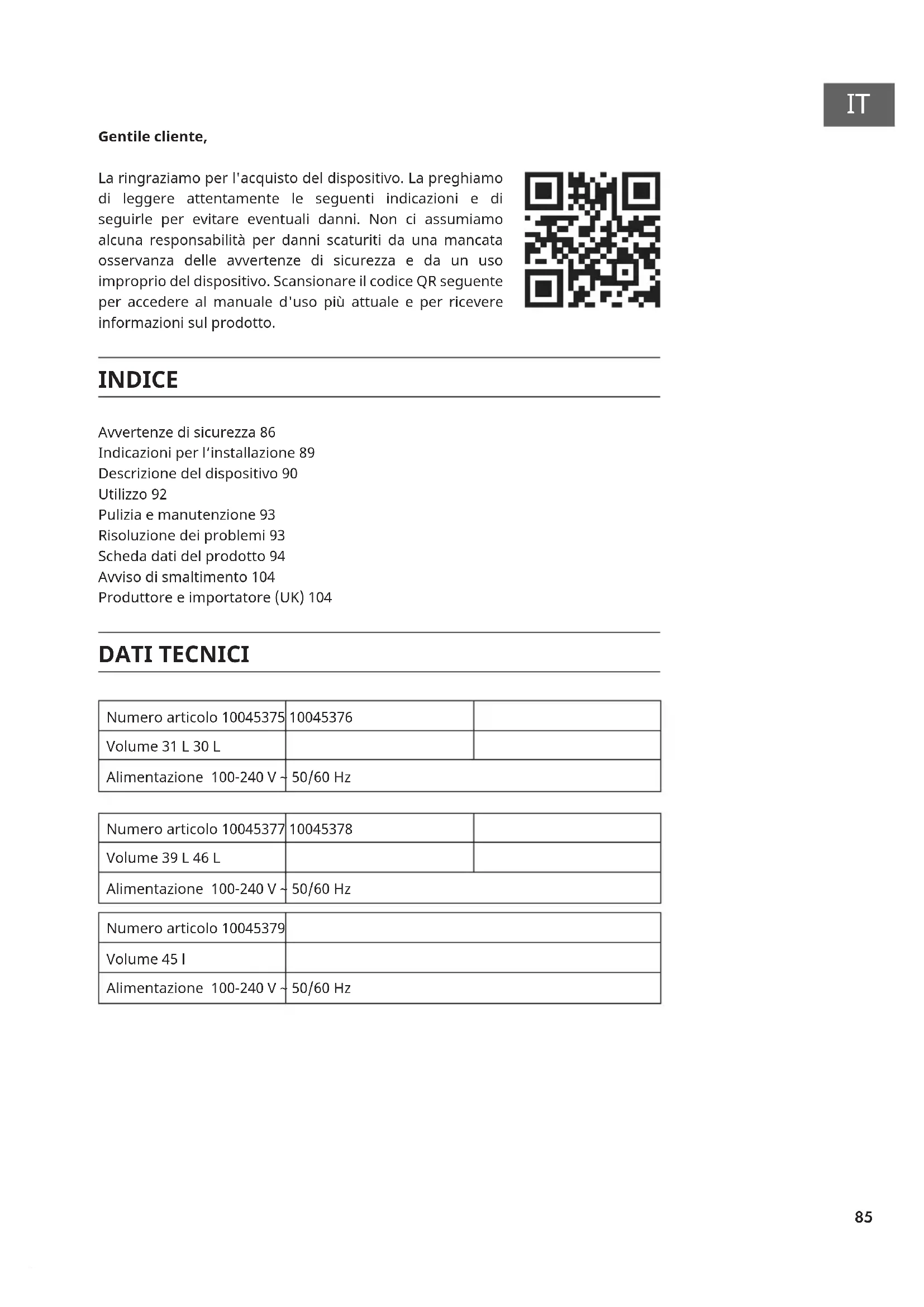 Gentile cliente, La ringraziamo per l'acquisto del dispositivo. La preghiamo di leggere attentamente le seguenti indicazioni e di seguirle per evitare eventuali danni. Non ci assumiamo alcuna responsabilità per danni scaturiti da una mancata osservanza delle avvertenze di sicurezza e da un uso improprio del dispositivo. Scansionare il codice QR seguente per accedere al manuale d'uso più attuale e per ricevere informazioni sul prodotto. INDICE Avvertenze di sicurezza 86 Indicazioni per l‘installazione 89 Descrizione del dispositivo 90 Utilizzo 92 Pulizia e manutenzione 93 Risoluzione dei problemi 93 Scheda dati del prodotto 94 Avviso di smaltimento 104 Produttore e importatore (UK) 104 DATI TECNICI Numero articolo 10045375 10045376 Volume 31 L 30 L Alimentazione 100-240 V ~ 50/60 Hz Numero articolo 10045377 10045378 Volume 39 L 46 L Alimentazione 100-240 V ~ 50/60 Hz Numero articolo 10045379 Volume 45 l Alimentazione 100-240 V ~ 50/60 Hz86