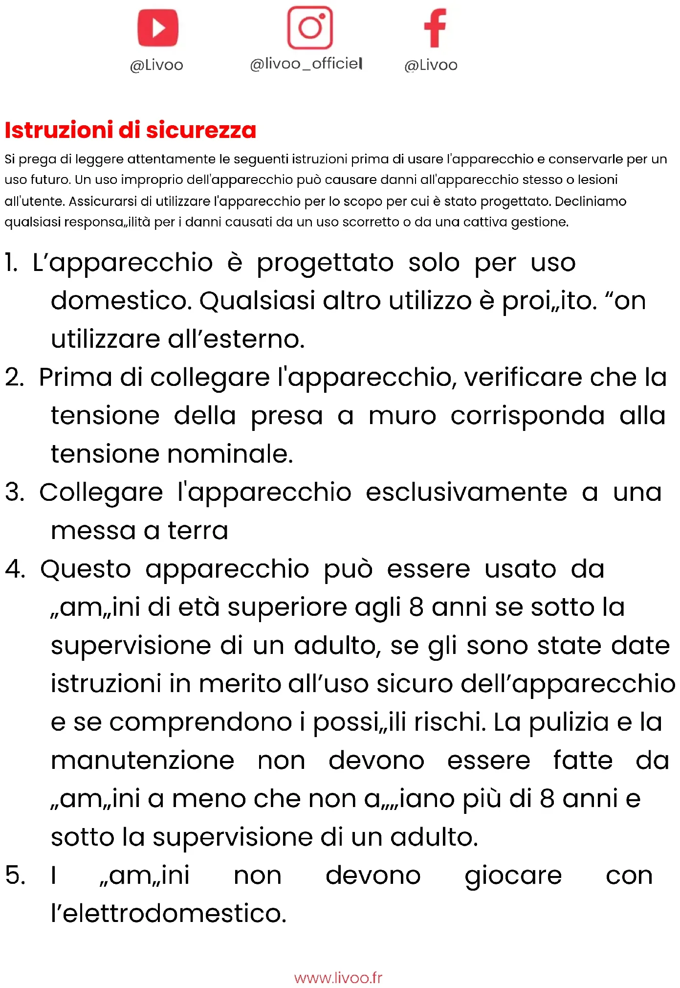 Grazie per avere scelto un prodotto Livoo! Il tuo mixer, il tuo barbecue, i tuoi auricolari non sono solo oggetti, sono un'estensione di te che ti permette di stare acconto alla tua famiglia e ai tuoi amici, di riunirli, ridere e condividere molte cose. Livoo vuole aiutarti a vivere a fondo la tua vita qualunque siano i tuoi desideri durante tutto l'anno. D'inverno, la raclette e d'estate il barbecue. O viceversa. Tocca te decidere. Approfitta di questa tua libertà per ottenere momenti feel good quotidiani. Ecco perché innoviamo continuamente e creiamo prodotti ingegnosi e efficienti e soprattutto accessibili a tutti. Ritrova l'insieme della nostra collezione sul nostro sito www.livoo.fr. Livoo, il tuo compagno quotidiano fino alle reti sociali! ITwww.livoo.fr