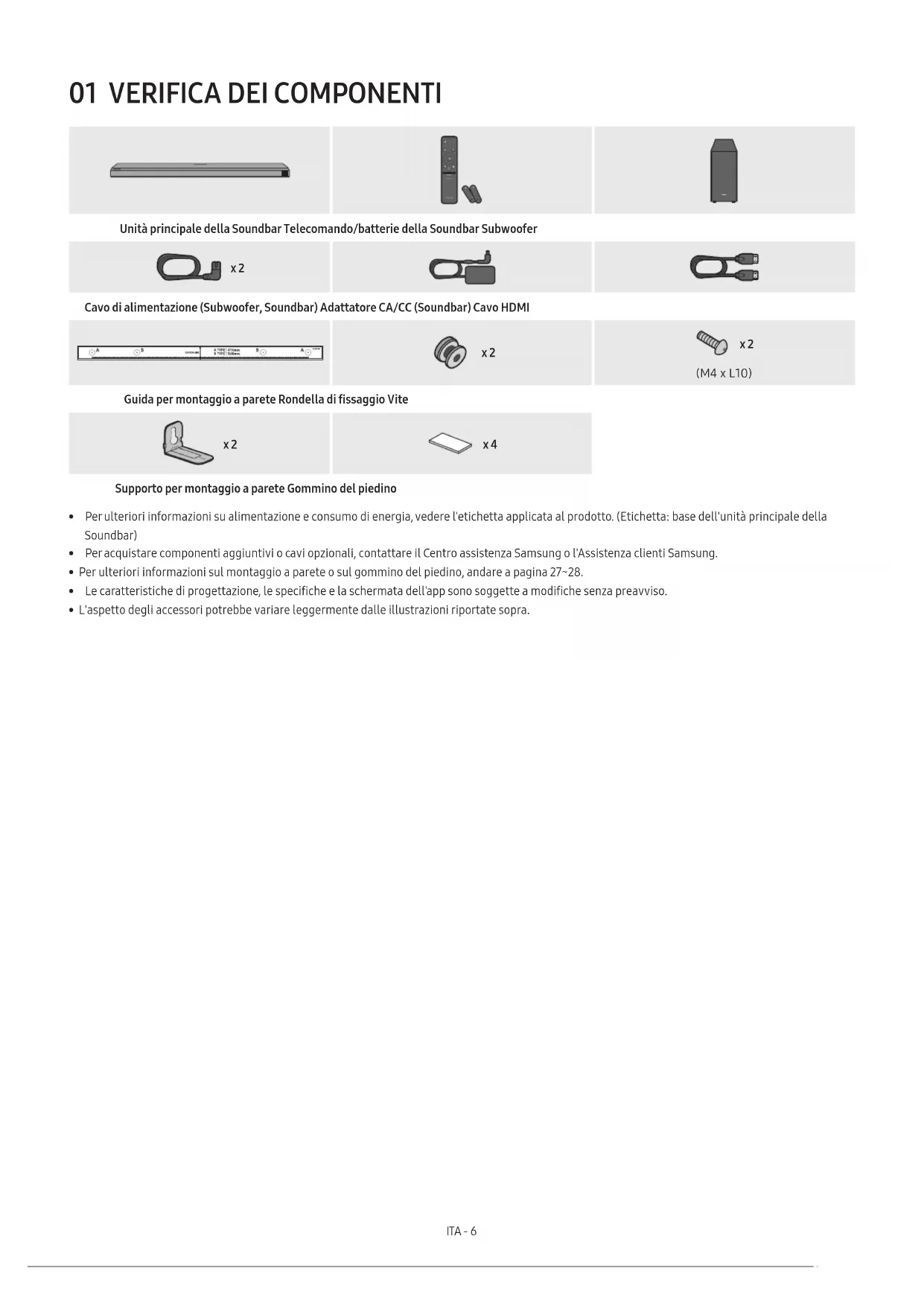 VOL WOOFER SOUNDBAR SOUND MODE PAIR Unità principale della Soundbar Telecomando/batterie della Soundbar Subwoofer x 2 Cavo di alimentazione (Subwoofer, Soundbar) Adattatore CA/CC (Soundbar) Cavo HDMI x 2 x 2 (M4 x L10) Guida per montaggio a parete Rondella di ssaggio Vite x 2 x 4 Supporto per montaggio a parete Gommino del piedino