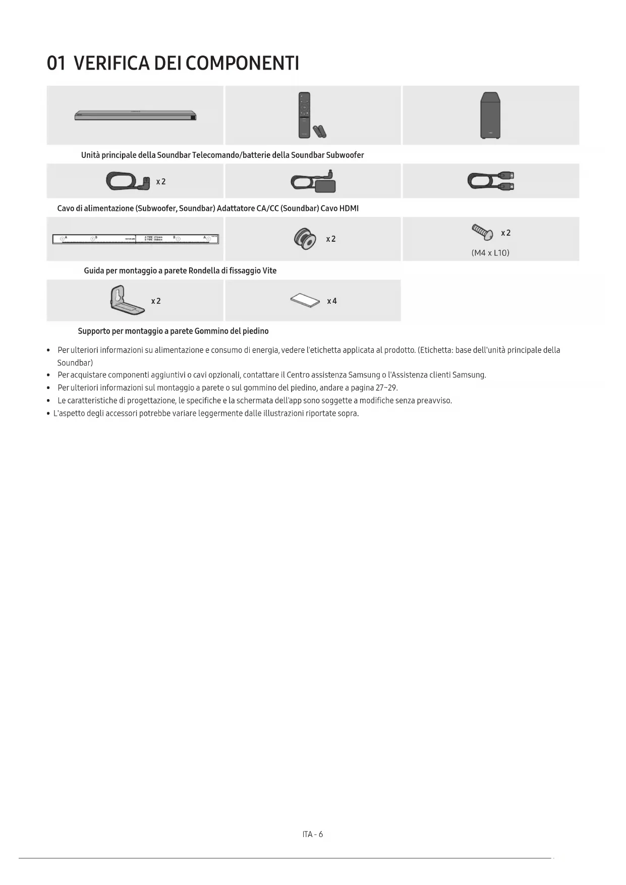 VOL WOOFER SOUNDBAR SOUND MODE PAIR Unità principale della Soundbar Telecomando/batterie della Soundbar Subwoofer x 2 Cavo di alimentazione (Subwoofer, Soundbar) Adattatore CA/CC (Soundbar) Cavo HDMI x 2 x 2 (M4 x L10) Guida per montaggio a parete Rondella di ssaggio Vite x 2 x 4 Supporto per montaggio a parete Gommino del piedino