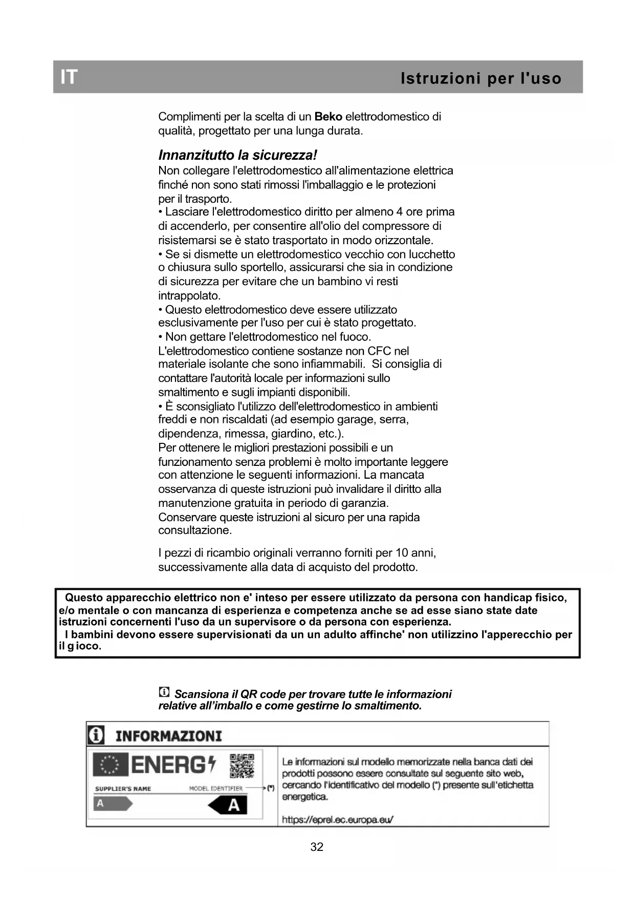 - È sconsigliato l'utilizzo dell'elettrodomestico in ambienti freddi e non riscaldati (ad esempio garage, serra, dipendenza, rimessa, giardino, etc.). Per ottenere le migliori prestazioni possibili e un funzionamento senza problemi è molto importante leggere con attenzione le seguenti informazioni. La mancata osservanza di queste istruzioni può invalidare il diritto alla manutenzione gratuita in periodo di garanzia. Conservare queste istruzioni al sicuro per una rapida consultazione. I pezzi di ricambio originali verranno forniti per 10 anni, successivamente alla data di acquisto del prodotto.