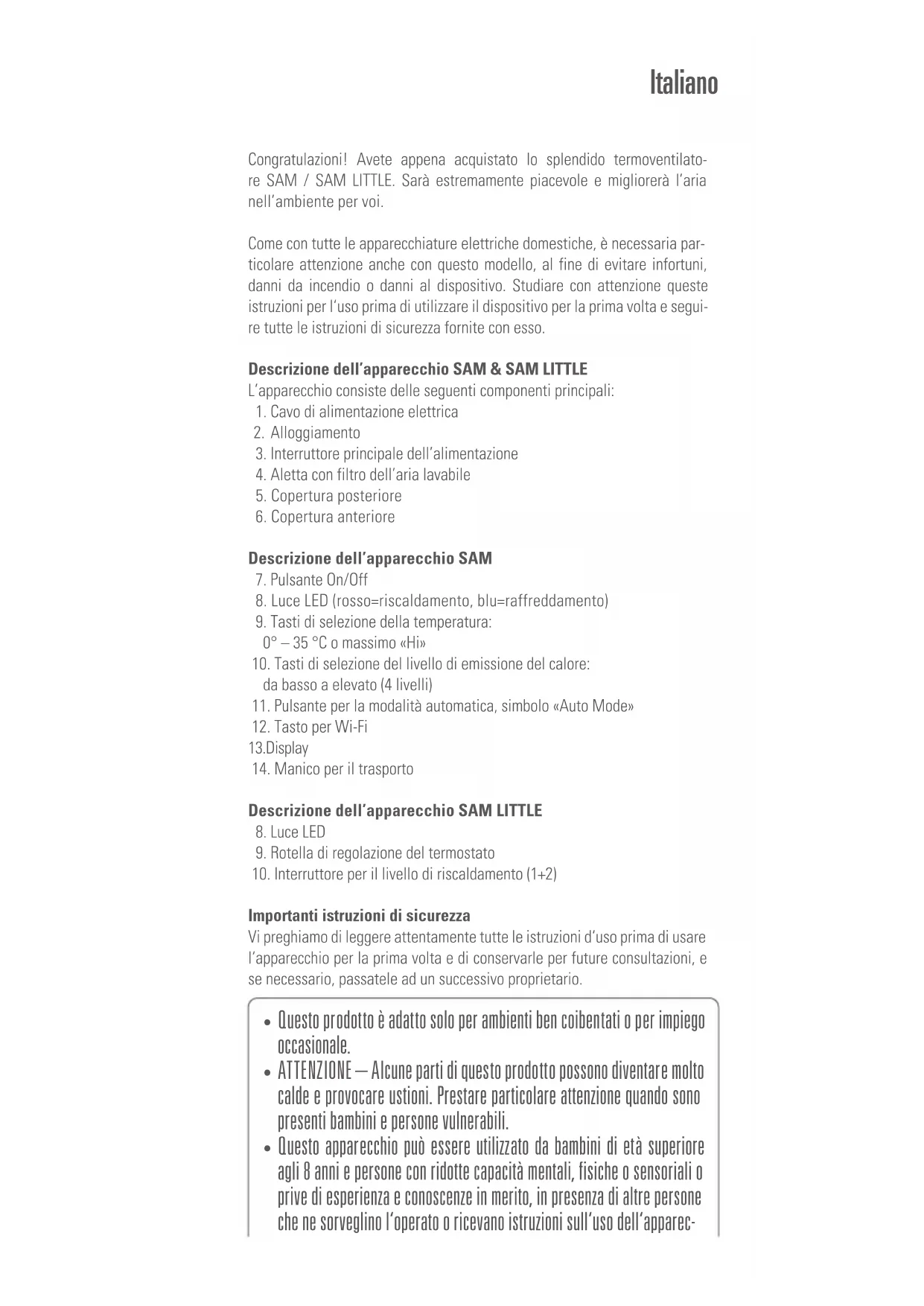- AVVERTENZA: non usare questo termoventilatore in stanze piccole se sono presenti persone non in grado di uscire da sole, a meno che non sia garantito un controllo costante.