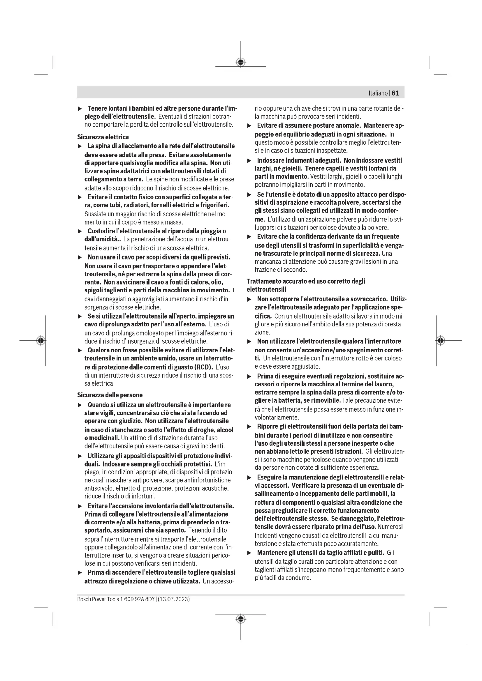 La levigatura di lamiere sottili o di altri materiali leggermente vibranti con ampia superficie può generare un aumento del valore di emissio- ne del rumore fino a 15dB. Grazie a idonee stuoie insonorizzanti pe- santi è possibile ridurre l’aumento dell’emissione acustica. L’aumento dell’emissione di rumore deve essere tenuto in considerazione sia per la valutazione dei rischi della potenza acustica sia per la scelta di una protezione acustica idonea. Il livello di vibrazione ed il valore di emissione acustica indi- cati nelle presenti istruzioni sono stati rilevati conformemen- te ad una procedura di misurazione unificata e sono utilizza- bili per confrontare gli elettroutensili. Le stesse procedure sono idonee anche per una valutazione temporanea del livel- lo di vibrazione e dell’emissione acustica. Il livello di vibrazione ed il valore di emissione acustica sono riferiti agli impieghi principali dell’elettroutensile; qualora, tuttavia, l’elettroutensile venisse utilizzato per altre applica- zioni, oppure con accessori differenti o in caso di insufficien- te manutenzione, il livello di vibrazione ed il valore di emis- sione acustica potrebbero variare. Ciò potrebbe aumentare sensibilmente l’emissione di vibrazioni e l’emissione acustica sull’intero periodo di funzionamento. Per valutare con precisione i valori di vibrazione e di emissio- ne acustica, andranno considerati anche i periodi nei quali l’utensile sia spento, oppure acceso, ma non utilizzato. Ciò potrebbe ridurre sensibilmente l’emissione di vibrazioni e l’emissione acustica sull’intero periodo di funzionamento. Adottare misure di sicurezza supplementari per proteggere l’operatore dall’effetto delle vibrazioni: ad esempio, sottopo- nendo a manutenzione l’elettroutensile e gli utensili accesso- ri, mantenendo calde le mani e organizzando i vari processi di lavoro. Protezione contro il riavvio accidentale La protezione contro un riavvio accidentale impedisce l’av- viamento incontrollato dell’elettroutensile dopo un’interru- zione dell’alimentazione di corrente. Per rimettere in funzione l’elettroutensile, portare l’inter- ruttore di avvio/arresto (3) in posizione di spegnimento e riaccendere l’elettroutensile. Montaggio Montaggio del dispositivo di sicurezza u Prima di qualunque intervento sull’elettroutensile estrarre la spina di rete dalla presa. Avvertenza: dopo una rottura della mola abrasiva durante il funzionamento, oppure in caso di danni ai dispositivi di al- loggiamento sulla cuffia di protezione/sull’elettroutensile, l’elettroutensile andrà immediatamente inviato al Servizio Clienti post-vendita. Per gli indirizzi, vedere il paragrafo «Servizio di assistenza e consulenza tecnica». Cuffia di protezione per levigatura Applicare la cuffia di protezione (7) nell’alloggiamento dell’elettroutensile, sino a quando le camme di codifica della cuffia stessa coincidano con l’al- loggiamento. A tale scopo, premere e mantenere premuta la leva di sbloc- caggio (1). Spingere la cuffia di protezione (7) sul collare dell’alberino, sino a quando la fascia della cuffia di protezione si trovi sulla flangia dell’elettroutensile e ruo- tare la cuffia di protezione sino a farla scattare udibilmente in posizione. Adattare la posizione della cuffia di protezione (7) in base al- la lavorazione da eseguire. A tale scopo, spingere la leva di sbloccaggio (1) verso l’alto e ruotare la cuffia di protezione (7) nella posizione desiderata. u Regolare sempre la cuffia di protezione(7) in modo che entrambe le camme della levatta di sbloccaggio (1) si innestino negli appositi incavi della cuffia di protezione (7). u Regolare la cuffia di protezione (7) in modo da impedi- re proiezioni di scintille in direzione dell’operatore. u Nella direzione di rotazione dell’accessorio, la cuffia di protezione(7) dovrà essere ruotata soltanto azio- nando la leva di sbloccaggio(1) ! In caso contrario, l’elettroutensile non andrà più utilizzato e andrà invia- to al Servizio Assistenza Clienti. Avvertenza: Le camme di codifica sulla cuffia di protezione (7) garantiscono che si possa montare soltanto una cuffia di protezione compatibile con l’elettroutensile del caso. Cuffia di aspirazione per levigatura Per levigare senza polvere colori, vernici e materiali plastici in combinazione con mole a tazza in metallo duro (11), si po- trà utilizzare la cuffia di aspirazione (6). La cuffia di aspira- zione (6) non è indicata per la lavorazione del metallo. Alla cuffia di aspirazione (6) si potrà collegare un aspiratore Bosch di tipo idoneo. Innestare a tal fine il tubo flessibile di aspirazione con l’adattatore di aspirazione nell’apposito at- tacco della cuffia di aspirazione. Cuffia di protezione per taglio u Per il taglio utilizzare sempre la cuffia di protezione per il taglio (8) o la cuffia di protezione per la levigatu- ra (7) insieme alla copertura per il taglio (9). u Per il taglio nella pietra, provvedere ad un’adeguata aspirazione della polvere. La cuffia di protezione per taglio (8) andrà montata analoga- mente alla cuffia di protezione per levigatura (7). Copertura in metallo per il taglio Montare la copertura in metallo per il taglio (9) sulla cuffia di protezione per la levigatura (7) (vedere fig. A): spostare all’indietro la staffa di ritegno (➊). Innestare la copertura (9) sulla cuffia di protezione per la levigatura (7) (➋). Premere a fondo la staffa di ritegno sulla cuffia di protezione (7) (➌). Per lo smontaggio (vedere immagine B) premere il pulsante 1 609 92A 8DY | (13.07.2023) Bosch Power ToolsItaliano | 67 sulla staffa di ritegno (➊) e spostarlo indietro (➋). Estrarre la copertura (9) dalla cuffia di protezione (7) (➌). Copertura in plastica per il taglio Innestare la copertura in plastica per il taglio(9) sulla cuffia di protezione per la levigatura(7) (vedere fig.C). La copertura(9) si innesta percettibilmente in sede e in modo visibile nella cuff