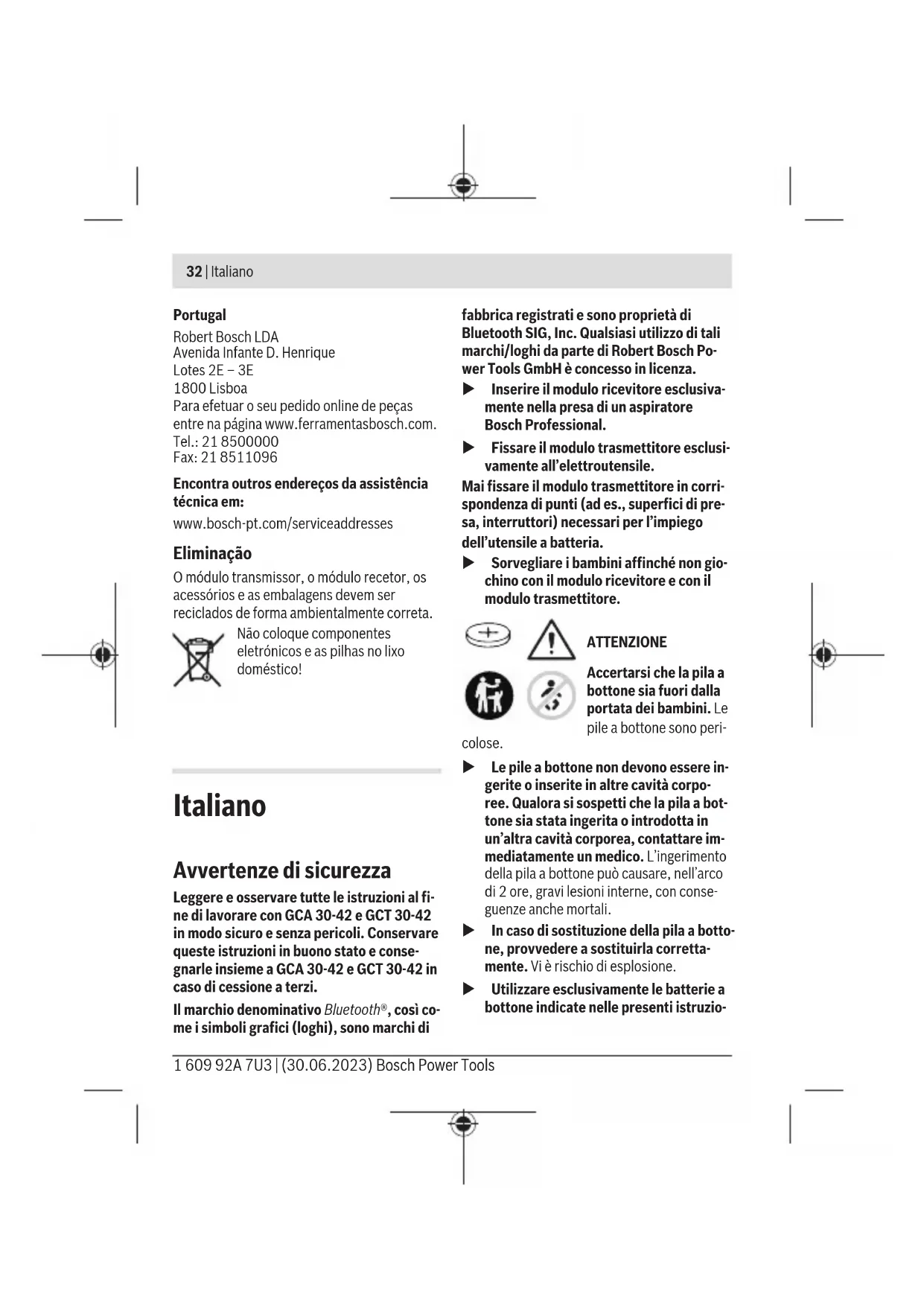 – Trocar a pilha botão Manutenção e assistência técnica Manutenção e limpeza Retire sujidade com um pincel ou um pano húmido. Não utilize detergentes ou solventes. Trocar pilha botão u Atenção: substitua sempre uma pilha botão por uma pilha botão do mesmo tipo. Há risco de explosão. u Elimine as pilhas botão descarregadas de forma correta. As pilhas botão podem perder a estanqueidade e, consequentemente, danificar o produto ou ferir pessoas. – Abra a tampa do compartimento da pilha na parte de trás do módulo transmissor com uma moeda. – Retire cuidadosamente a pilha botão gasta e coloque uma pilha botão nova. Observe a identificação relativa à colocação correta da pilha botão. – Feche a tampa do compartimento da pilha com uma moeda. Rode a tampa até ao batente, para garantir um fecho correto. Serviço pós-venda e aconselhamento O serviço pós-venda responde às suas perguntas a respeito de serviços de reparação e de manutenção do seu produto, assim como das peças sobressalentes. Desenhos explodidos e informações acerca das peças sobressalentes também em: www.bosch- pt.com A nossa equipa de consultores Bosch esclarece com prazer todas as suas dúvidas a respeito dos nossos produtos e acessórios. Indique para todas as questões e encomendas de peças sobressalentes a referência de 10 dígitos de acordo com a placa de caraterísticas do produto. Bosch Power Tools 1 609 92A 7U3 | (30.06.2023)32 | ItalianoPortugalRobert Bosch LDAAvenida Infante D. HenriqueLotes 2E – 3E 1800 LisboaPara efetuar o seu pedido online de peçasentre na página www.ferramentasbosch.com.Tel.: 21 8500000Fax: 21 8511096Encontra outros endereços da assistênciatécnica em:www.bosch-pt.com/serviceaddresses Eliminação O módulo transmissor, o módulo recetor, osacessórios e as embalagens devem serreciclados de forma ambientalmente correta.Não coloque componenteseletrónicos e as pilhas no lixodoméstico! Italiano Avvertenze di sicurezza Leggere e osservare tutte le istruzioni al fi-ne di lavorare con GCA30-42 e GCT 30-42in modo sicuro e senza pericoli. Conservarequeste istruzioni in buono stato e conse-gnarle insieme a GCA30-42 e GCT 30-42 incaso di cessione a terzi.Il marchio denominativo Bluetooth®, così co-me i simboli grafici (loghi), sono marchi difabbrica registrati e sono proprietà diBluetooth SIG, Inc. Qualsiasi utilizzo di talimarchi/loghi da parte di Robert Bosch Po-wer Tools GmbH è concesso in licenza. u Inserire il modulo ricevitore esclusiva- mente nella presa di un aspiratoreBosch Professional. u Fissare il modulo trasmettitore esclusi- vamente all’elettroutensile.Mai fissare il modulo trasmettitore in corri-spondenza di punti (ad es., superfici di pre-sa, interruttori) necessari per l’impiegodell’utensile a batteria. u Sorvegliare i bambini affinché non gio- chino con il modulo ricevitore e con ilmodulo trasmettitore.ATTENZIONEAccertarsi che la pila abottone sia fuori dallaportata dei bambini. Lepile a bottone sono peri-colose. u Le pile a bottone non devono essere in- gerite o inserite in altre cavità corpo-ree. Qualora si sospetti che la pila a bot-tone sia stata ingerita o introdotta inun’altra cavità corporea, contattare im-mediatamente un medico. L’ingerimentodella pila a bottone può causare, nell’arcodi 2 ore, gravi lesioni interne, con conse-guenze anche mortali. u In caso di sostituzione della pila a botto- ne, provvedere a sostituirla corretta-mente. Vi è rischio di esplosione. u Utilizzare esclusivamente le batterie a bottone indicate nelle presenti istruzio- 1 609 92A 7U3 | (30.06.2023) Bosch Power ToolsItaliano | 33 ni d’uso. Non utilizzare altri tipi di batterie a bottone, né altri tipi di alimentazione. u Non tentare di ricaricare la pila a botto- ne e non cortocircuitarla. La pila a botto- ne può diventare anermetica, esplodere, incendiarsi e causare lesioni. u Rimuovere e smaltire le pile a bottone scariche nel rispetto delle norme locali. Le pile a bottone scariche possono diven- tare anermetiche e, di conseguenza, dan- neggiare il prodotto, oppure causare lesio- ni. u Non far surriscaldare la pila a bottone e non gettarla nel fuoco. La pila a bottone può diventare anermetica, esplodere, in- cendiarsi e causare lesioni. u Non danneggiare, né smontare la pila a bottone. La pila a bottone può diventare anermetica, esplodere, incendiarsi e cau- sare lesioni. u Non portare una pila a bottone danneg- giata a contatto con l’acqua. A contatto con l’acqua, il litio che fuoriesce dalla pila può generare idrogeno e causare un incen- dio o un’esplosione, oppure causare lesio- ni. Descrizione del prodotto e dei servizi forniti Utilizzo conforme Il modulo ricevitore GCA30-42 riceve un se- gnale di accensione/spegnimento per un aspi- ratore Bosch Professional. Questo segnale verrà trasmesso dal modulo trasmettitore GCT30-42. Ulteriori informazioni sono reperibili nelle istruzioni d’uso del modulo trasmettitore GCT30-42 e dell’aspiratore utilizzato. Componenti illustrati La numerazione dei componenti rappresentati si riferisce alle illustrazioni sulle pagine con la rappresentazione grafica. Componenti GCA 30-42 (1) Modulo ricevitore (2) Indicatore di stato con simbolo di avvio automatico (interfaccia di comando) (3) Tasto (interfaccia di comando) (4) Spina Componenti GCT 30-42 (5) Modulo trasmettitore (6) Indicatore di stato a LED (interfaccia di comando) (7) Tasto di accensione/spegnimento (inter- faccia di comando) (8) Ganci di fissaggio nastro in gomma (9) Nastro in gomma Dati tecnici Modulo ricevitore GCA 30-42 Codice prodotto 1 600 A02 GE. Temperatura di eser- cizio −20...+50°C Temperatura di ma- gazzinaggio −20...+65°C Dimensioni (larghez- za x altezza) 91 x 121 mm Trasferimento dati Bluetooth® Bluetooth® 4.2 (Low Energy) Campo di frequenza utilizzato 2402–2480 MHz Bosch Power Tools 1 609 92A 7U3 | (30.06.2023)34 | Italiano Modulo ricevitore GCA 30-42 Potenza di uscita < 10mW Modulo trasmettit