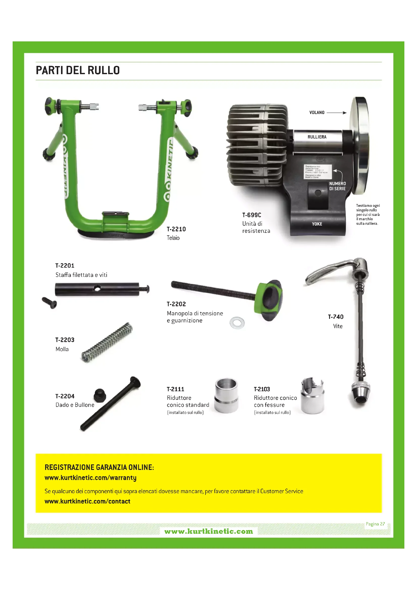Pagina 27 REGISTRAZIONE GARANZIA ONLINE: www.kurtkinetic.com/warranty Se qualcuno dei componenti qui sopra elencati dovesse mancare, per favore contattare il Customer Service www.kurtkinetic.com/contact RULLIERA VOLANO YOKE NUMERO DI SERIE T-699C Unità di resistenza Testiamo ogni singolo rullo per cui ci sarà il marchio sulla rulliera. T-2111 Riduttore conico standard (installato sul rullo) T-2103 Riduttore conico con fessure (installato sul rullo)www.kurtkinetic.com