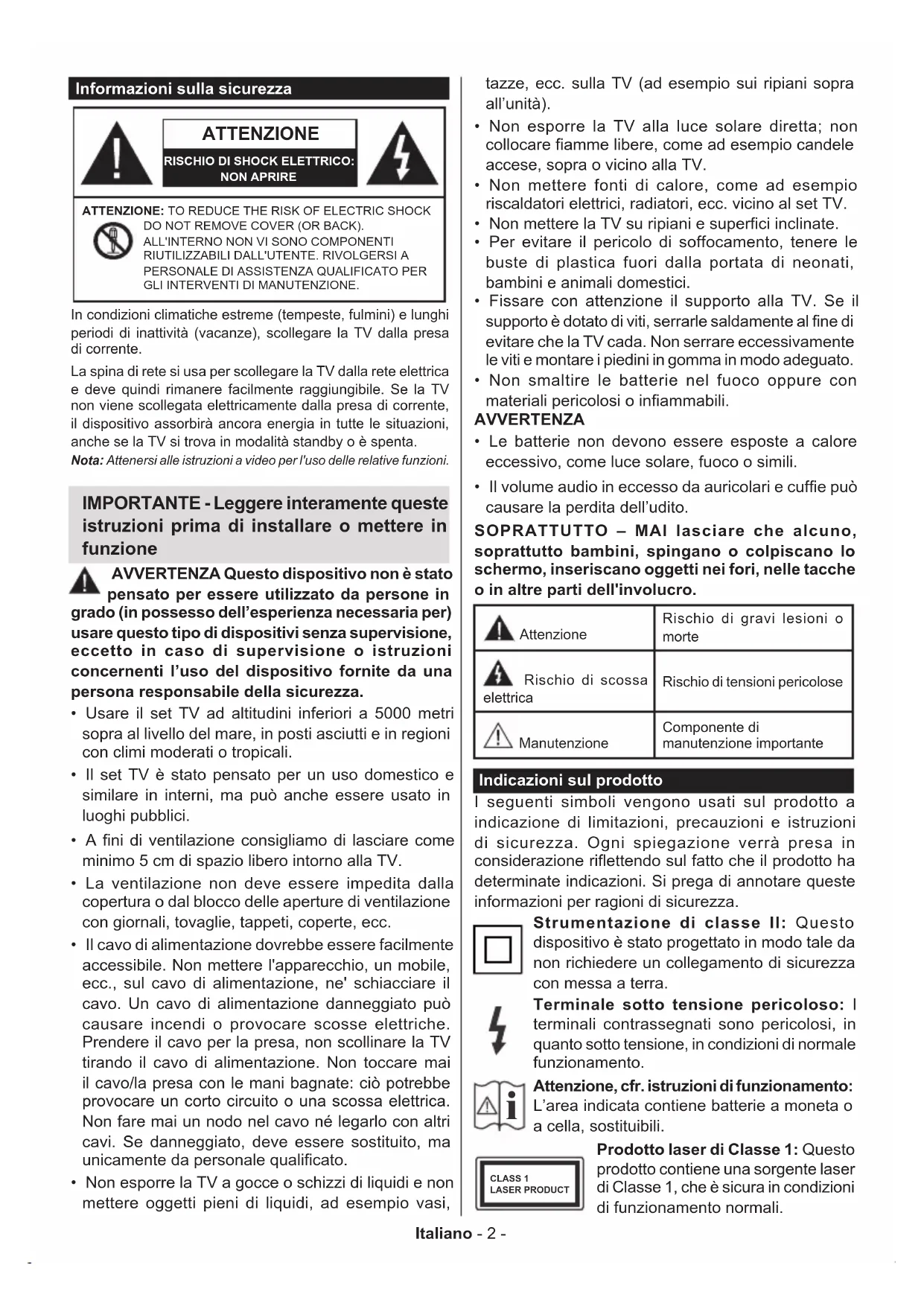 - Il volume audio in eccesso da auricolari e cuffie può causare la perdita dell’udito. SOPRATTUTTO – MAI lasciare che alcuno, soprattutto bambini, spingano o colpiscano lo schermo, inseriscano oggetti nei fori, nelle tacche o in altre parti dell'involucro. Attenzione Rischio di gravi lesioni o morte Rischio di scossa elettrica Rischio di tensioni pericolose Manutenzione Componente di manutenzione importante Indicazioni sul prodotto I seguenti simboli vengono usati sul prodotto a indicazione di limitazioni, precauzioni e istruzioni di sicurezza. Ogni spiegazione verrà presa in considerazione riflettendo sul fatto che il prodotto ha determinate indicazioni. Si prega di annotare queste informazioni per ragioni di sicurezza. Strumentazione di classe II: Questo dispositivo è stato progettato in modo tale da non richiedere un collegamento di sicurezza con messa a terra. Terminale sotto tensione pericoloso: I terminali contrassegnati sono pericolosi, in quanto sotto tensione, in condizioni di normale funzionamento.