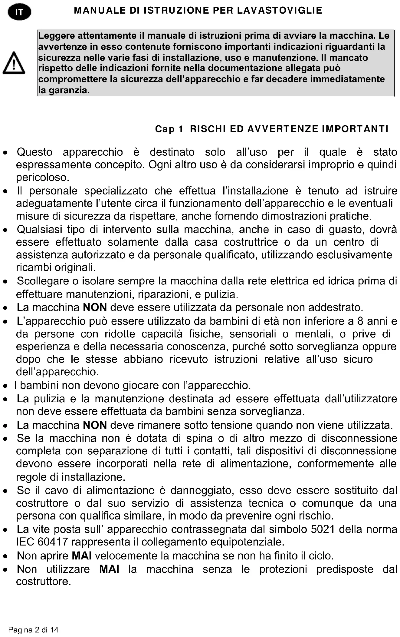 Questo apparecchio è destinato solo all’uso per il quale è stato espressamente concepito. Ogni altro uso è da considerarsi improprio e quindi pericoloso. Il personale specializzato che effettua l’installazione è tenuto ad istruire adeguatamente l’utente circa il funzionamento dell’apparecchio e le eventuali misure di sicurezza da rispettare, anche fornendo dimostrazioni pratiche. Qualsiasi tipo di intervento sulla macchina, anche in caso di guasto, dovrà essere effettuato solamente dalla casa costruttrice o da un centro di assistenza autorizzato e da personale qualificato, utilizzando esclusivamente ricambi originali. Scollegare o isolare sempre la macchina dalla rete elettrica ed idrica prima di effettuare manutenzioni, riparazioni, e pulizia. La macchina NON deve essere utilizzata da personale non addestrato. L’apparecchio può essere utilizzato da bambini di età non inferiore a 8 anni e da persone con ridotte capacità fisiche, sensoriali o mentali, o prive di esperienza e della necessaria conoscenza, purché sotto sorveglianza oppure dopo che le stesse abbiano ricevuto istruzioni relative all’uso sicuro dell’apparecchio. I bambini non devono giocare con l’apparecchio. La pulizia e la manutenzione destinata ad essere effettuata dall’utilizzatore non deve essere effettuata da bambini senza sorveglianza. La macchina NON deve rimanere sotto tensione quando non viene utilizzata. Se la macchina non è dotata di spina o di altro mezzo di disconnessione completa con separazione di tutti i contatti, tali dispositivi di disconnessione devono essere incorporati nella rete di alimentazione, conformemente alle regole di installazione. Se il cavo di alimentazione è danneggiato, esso deve essere sostituito dal costruttore o dal suo servizio di assistenza tecnica o comunque da una persona con qualifica similare, in modo da prevenire ogni rischio. La vite posta sull’ apparecchio contrassegnata dal simbolo 5021 della norma IEC 60417 rappresenta il collegamento equipotenziale. Non aprire MAI velocemente la macchina se non ha finito il ciclo. Non utilizzare MAI la macchina senza le protezioni predisposte dal costruttore.MANUALE DI ISTRUZIONE PER LAVASTOVIGLIE Pagina 3 di 14