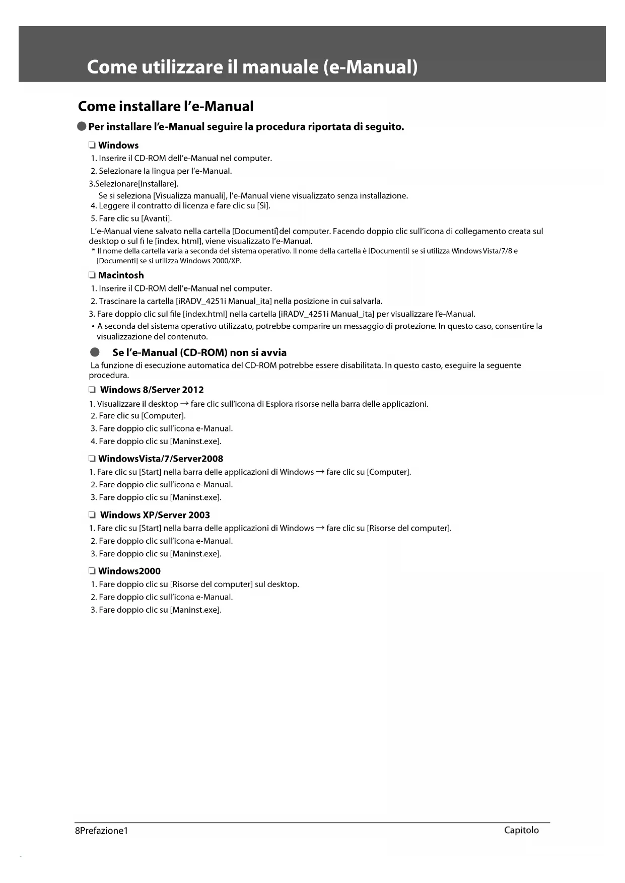 3. Fare doppio clic sul le [index.html] nella cartella [iRADV_4251i Manual_ita] per visualizzare l’e-Manual.