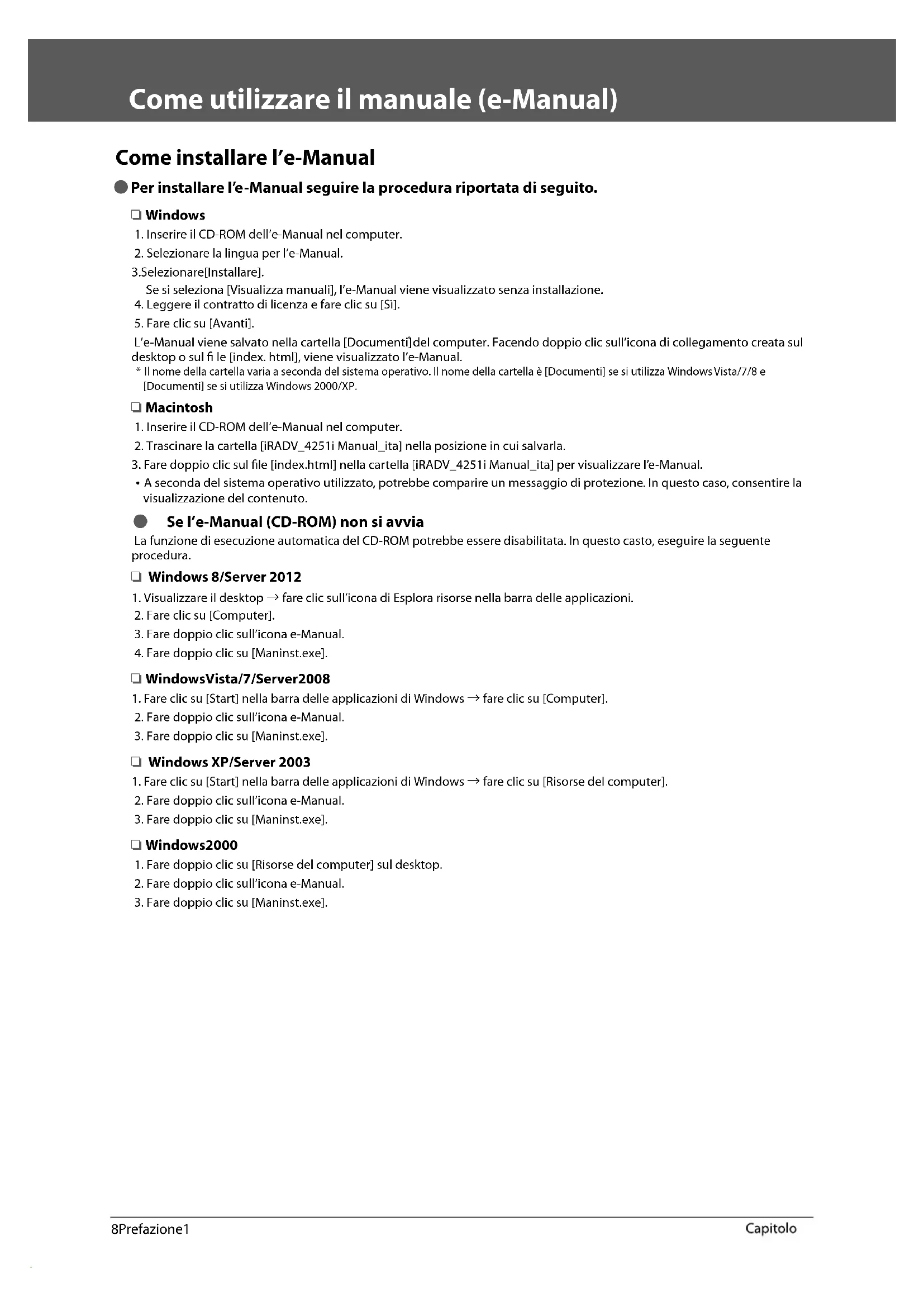 2. Fare doppio clic sull’icona e-Manual. 3. Fare doppio clic su [Maninst.exe]. ❏ Windows 2000 1. Fare doppio clic su [Risorse del computer] sul desktop. 2. Fare doppio clic sull’icona e-Manual. 3. Fare doppio clic su [Maninst.exe].Italiano 9 Prefazione 1 Prima pagina dell’e-Manual