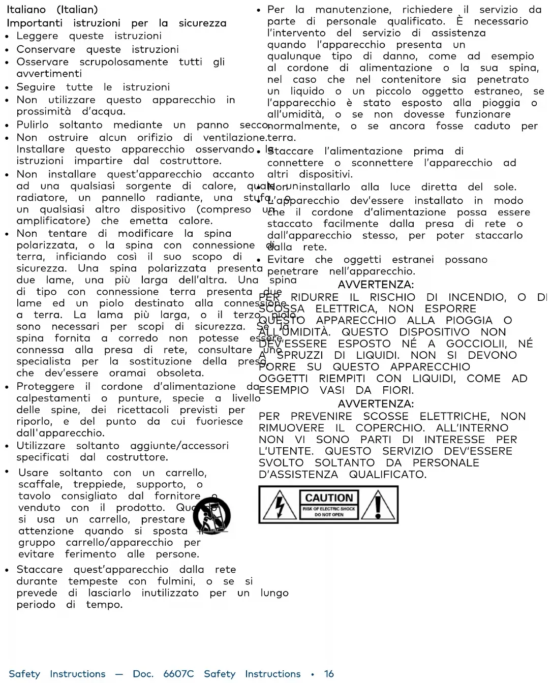 D’ASSISTENZA QUALIFICATO.17 • Safety Instructions Safety Instructions — Doc. 6607C Un simbolo di fulmine con l’estremità a forma di freccia all’interno di un triangolo equilatero, è previsto per indicare all’utente la presenza di ‘tensioni pericolose’ non isolate all’interno del contenitore del prodotto, che si possono rivelare di un’importanza sufficiente da costituire un rischio di scosse elettriche per le persone. Il punto esclamativo all’interno di un triangolo equilatero è previsto per avvertire l’utente della presenza di importanti istruzioni operative e di manutenzione (servizio) nella documentazione a corredo pertinente questo apparecchio. AVVERTENZA: