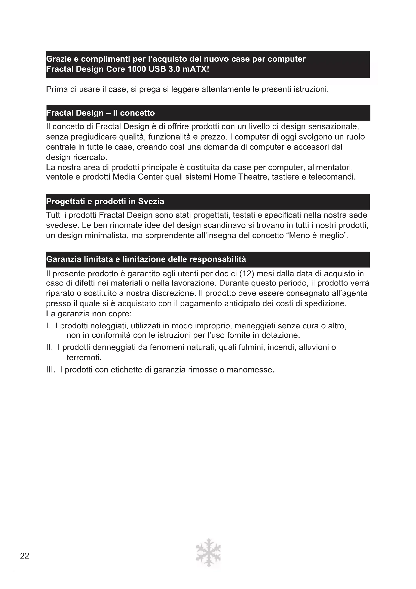 KO22 Grazie e complimenti per l’acquisto del nuovo case per computer Fractal Design Core 1000 USB 3.0 mATX! Prima di usare il case, si prega si leggere attentamente le presenti istruzioni. Fractal Design – il concetto Il concetto di Fractal Design è di offrire prodotti con un livello di design sensazionale, senza pregiudicare qualità, funzionalità e prezzo. I computer di oggi svolgono un ruolo centrale in tutte le case, creando così una domanda di computer e accessori dal design ricercato. La nostra area di prodotti principale è costituita da case per computer, alimentatori, ventole e prodotti Media Center quali sistemi Home Theatre, tastiere e telecomandi. Progettati e prodotti in Svezia Tutti i prodotti Fractal Design sono stati progettati, testati e specifi cati nella nostra sede svedese. Le ben rinomate idee del design scandinavo si trovano in tutti i nostri prodotti; un design minimalista, ma sorprendente all’insegna del concetto “Meno è meglio”. Garanzia limitata e limitazione delle responsabilità Il presente prodotto è garantito agli utenti per dodici (12) mesi dalla data di acquisto in caso di difetti nei materiali o nella lavorazione. Durante questo periodo, il prodotto verrà riparato o sostituito a nostra discrezione. Il prodotto deve essere consegnato all’agente presso il quale si è acquistato con il pagamento anticipato dei costi di spedizione. La garanzia non copre: