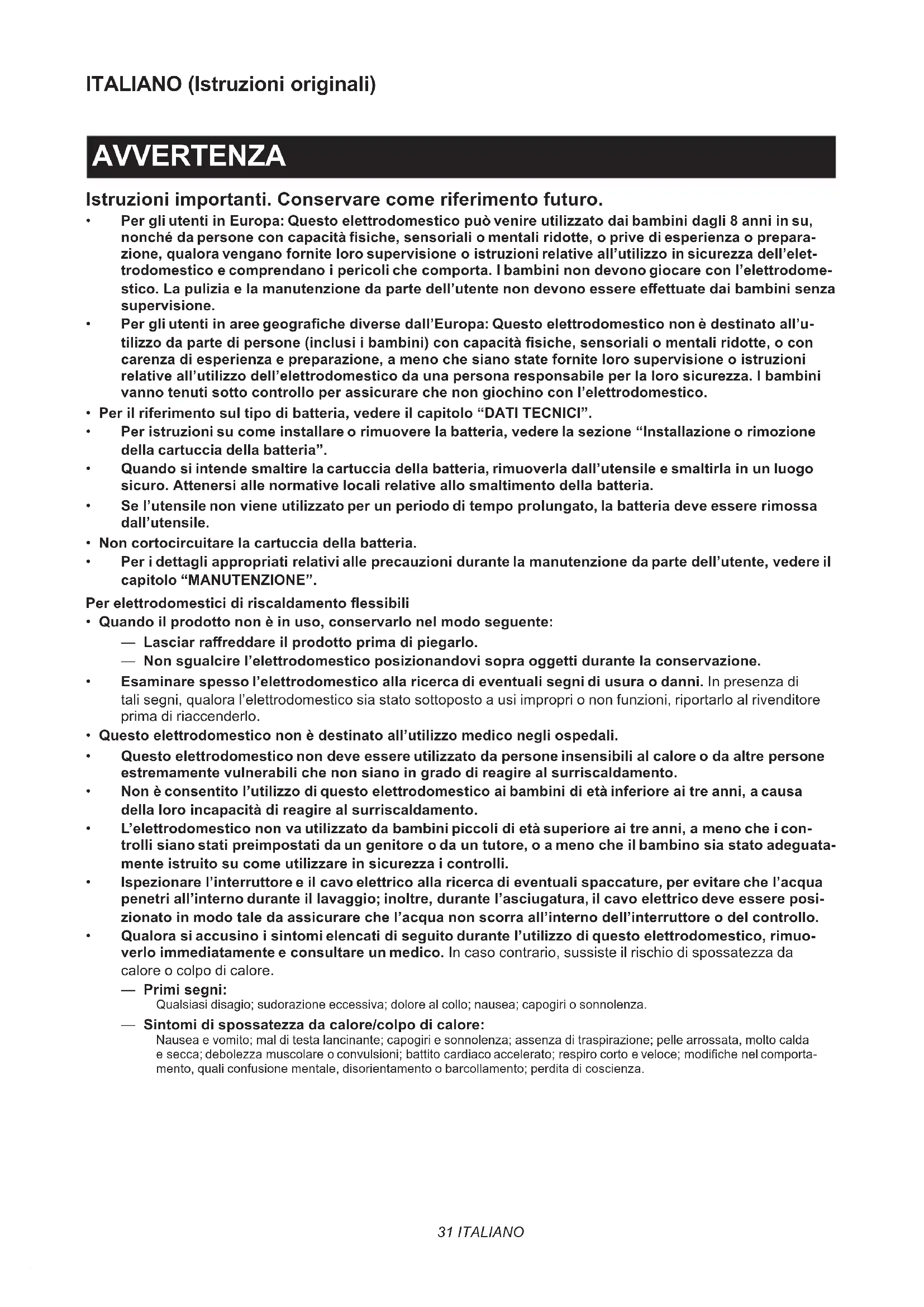 - Questo elettrodomestico non deve essere utilizzato da persone insensibili al calore o da altre persone estremamente vulnerabili che non siano in grado di reagire al surriscaldamento.