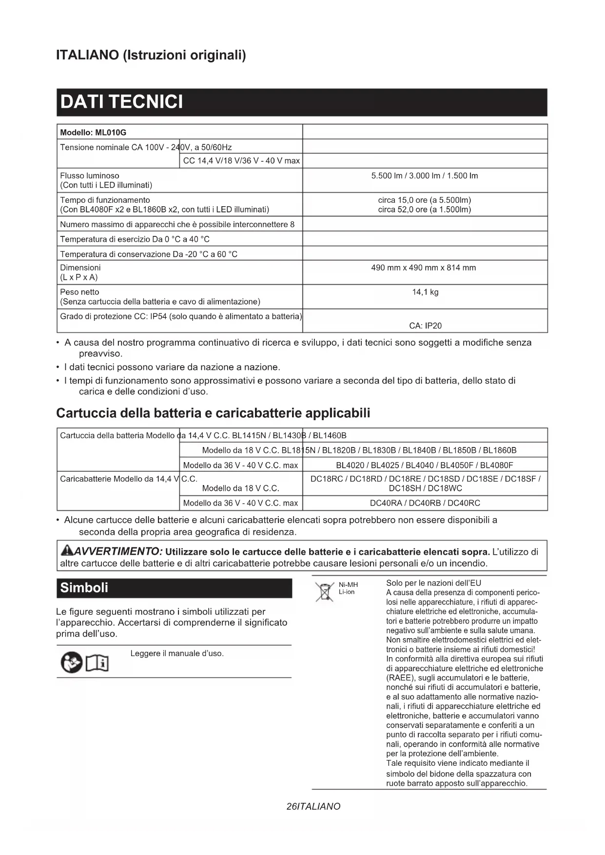 - Alcune cartucce delle batterie e alcuni caricabatterie elencati sopra potrebbero non essere disponibili a seconda della propria area geograca di residenza. AVVERTIMENTO: Utilizzare solo le cartucce delle batterie e i caricabatterie elencati sopra. L’utilizzo di altre cartucce delle batterie e di altri caricabatterie potrebbe causare lesioni personali e/o un incendio. Simboli Le gure seguenti mostrano i simboli utilizzati per l’apparecchio. Accertarsi di comprenderne il signicato prima dell’uso. Leggere il manuale d’uso. Ni-MH Li-ion Solo per le nazioni dell’EU A causa della presenza di componenti perico- losi nelle apparecchiature, i riuti di apparec- chiature elettriche ed elettroniche, accumula- tori e batterie potrebbero produrre un impatto negativo sull’ambiente e sulla salute umana. Non smaltire elettrodomestici elettrici ed elet- tronici o batterie insieme ai riuti domestici! In conformità alla direttiva europea sui riuti di apparecchiature elettriche ed elettroniche (RAEE), sugli accumulatori e le batterie, nonché sui riuti di accumulatori e batterie, e al suo adattamento alle normative nazio- nali, i riuti di apparecchiature elettriche ed elettroniche, batterie e accumulatori vanno conservati separatamente e conferiti a un punto di raccolta separato per i riuti comu- nali, operando in conformità alle normative per la protezione dell’ambiente. Tale requisito viene indicato mediante il simbolo del bidone della spazzatura con ruote barrato apposto sull’apparecchio.27 ITALIANO Adottare cura e attenzione particolari. Radiazione ottica (UV e IR). Ridurre al minimo l’esposizione degli occhi o della pelle. Non ssare lo sguardo sulla lampada accesa. Utilizzare una schermatura appropriata o una protezione per gli occhi. Non utilizzare l’elettrodomestico sotto la pioggia, la neve, in condizioni di umidità o di bagnato quando si intende utilizzarlo con l’alimentazione CA. Pulsante di riarmo dell’interruttore automatico. Nota Questo prodotto contiene fonti di luce con classi di ecienza energetica <C> e <D>. Alimentazione L’utensile va collegato esclusivamente a una fonte di alimentazione con una tensione identica a quella indicata sulla targhetta di identicazione, e può venire fatto funzionare solo con alimentazione CA monofase. Questo utensile va collegato a terra durante l’uso, per proteggere l’operatore dalle scosse elettriche. Utilizzare esclusivamente cavi di prolunga tripolari dotati di spine tripolari con messa a terra, nonché prese elettriche tripolari compatibili con la spina dell’utensile. AVVERTENZE DI SICUREZZA