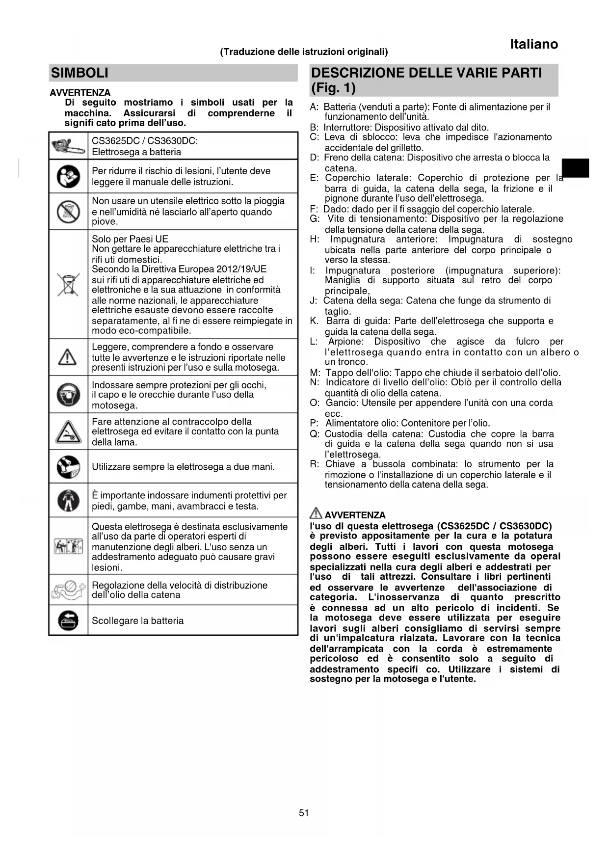 (Fig. 1) A: Batteria (venduti a parte): Fonte di alimentazione per il funzionamento dell’unità. B: Interruttore: Dispositivo attivato dal dito. C: Leva di sblocco: leva che impedisce l'azionamento accidentale del grilletto. D: Freno della catena: Dispositivo che arresta o blocca la catena. E: Coperchio laterale: Coperchio di protezione per la barra di guida, la catena della sega, la frizione e il pignone durante l’uso dell’elettrosega. F: Dado: dado per il fi ssaggio del coperchio laterale. G: Vite di tensionamento: Dispositivo per la regolazione della tensione della catena della sega. H: Impugnatura anteriore: Impugnatura di sostegno ubicata nella parte anteriore del corpo principale o verso la stessa. I: Impugnatura posteriore (impugnatura superiore): Maniglia di supporto situata sul retro del corpo principale, J: Catena della sega: Catena che funge da strumento di taglio. K. Barra di guida: Parte dell’elettrosega che supporta e guida la catena della sega. L: Arpione: Dispositivo che agisce da fulcro per l’elettrosega quando entra in contatto con un albero o un tronco. M: Tappo dell'olio: Tappo che chiude il serbatoio dell’olio. N: Indicatore di livello dell’olio: Oblò per il controllo della quantità di olio della catena. O: Gancio: Utensile per appendere l’unità con una corda ecc. P: Alimentatore olio: Contenitore per l’olio. Q: Custodia della catena: Custodia che copre la barra di guida e la catena della sega quando non si usa l’elettrosega. R: Chiave a bussola combinata: lo strumento per la rimozione o l'installazione di un coperchio laterale e il tensionamento della catena della sega. AVVERTENZA l'uso di questa elettrosega (CS3625DC / CS3630DC) è previsto appositamente per la cura e la potatura degli alberi. Tutti i lavori con questa motosega possono essere eseguiti esclusivamente da operai specializzati nella cura degli alberi e addestrati per l'uso di tali attrezzi. Consultare i libri pertinenti ed osservare le avvertenze dell'associazione di categoria. L'inosservanza di quanto prescritto è connessa ad un alto pericolo di incidenti. Se la motosega deve essere utilizzata per eseguire lavori sugli alberi consigliamo di servirsi sempre di un'impalcatura rialzata. Lavorare con la tecnica dell'arrampicata con la corda è estremamente pericoloso ed è consentito solo a seguito di addestramento specifi co. Utilizzare i sistemi di sostegno per la motosega e l'utente. 00BookCS3625DCEU.indb5100BookCS3625DCEU.indb51 2022/12/0816:29:192022/12/0816:29:1952 Italiano