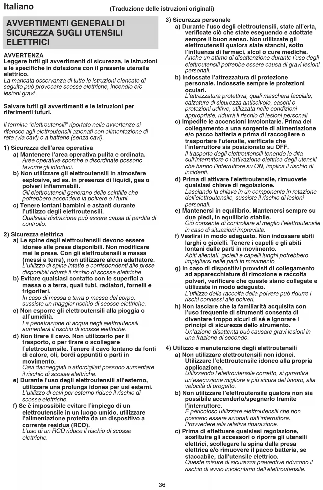 a) Non utilizzare elettroutensili non idonei. Utilizzare l’elettroutensile idoneo alla propria applicazione. Utilizzando l’elettroutensile corretto, si garantirà un’esecuzione migliore e più sicura del lavoro, alla velocità di progetto. b) Non utilizzare l’elettroutensile qualora non sia possibile accenderlo/spegnerlo tramite l’interruttore. É pericoloso utilizzare elettroutensili che non possano essere azionati dall’interruttore. Provvedere alla relativa riparazione. c) Prima di effettuare qualsiasi regolazione, sostituire gli accessori o riporre gli utensili elettrici, scollegare la spina dalla presa elettrica e/o rimuovere il pacco batteria, se staccabile, dall’utensile elettrico. Queste misure di sicurezza preventive riducono il rischio di avvio involontario dell’elettroutensile. 2023/07/20 17:28:43Stylesheet: EU Version: 2023.6.21 H3641DA_C99749471_308_EUItaliano