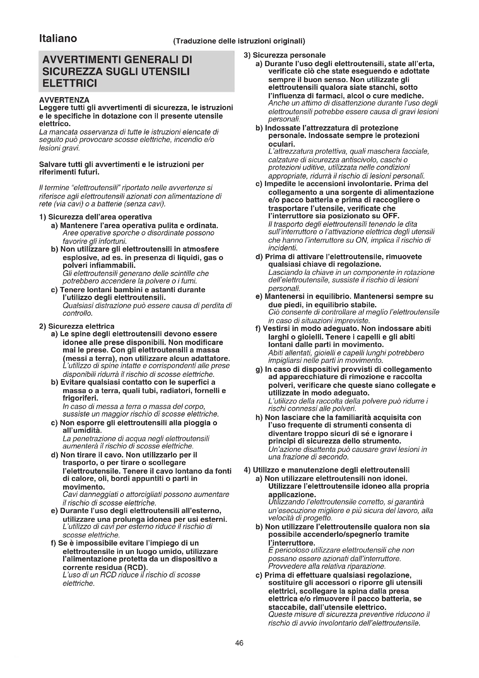 a) Non utilizzare elettroutensili non idonei. Utilizzare l’elettroutensile idoneo alla propria applicazione. Utilizzando l’elettroutensile corretto, si garantirà un’esecuzione migliore e più sicura del lavoro, alla velocità di progetto. b) Non utilizzare l’elettroutensile qualora non sia possibile accenderlo/spegnerlo tramite l’interruttore. É pericoloso utilizzare elettroutensili che non possano essere azionati dall’interruttore. Provvedere alla relativa riparazione. c) Prima di effettuare qualsiasi regolazione, sostituire gli accessori o riporre gli utensili elettrici, scollegare la spina dalla presa elettrica e/o rimuovere il pacco batteria, se staccabile, dall’utensile elettrico. Queste misure di sicurezza preventive riducono il rischio di avvio involontario dell’elettroutensile. 2023/07/11 14:06:04Stylesheet: EU Version: 2023.6.21 C1806DUM_C99749271_306_EUItaliano