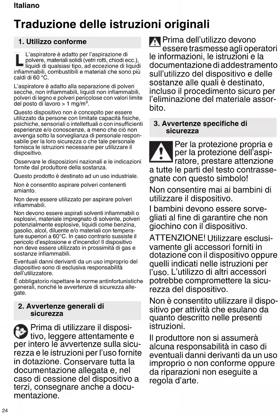 sicurezza RP250YBL_C99749871_305.book 24 ページ 2023年4月6日 木曜日 午後12時6分25 Italiano Qualora il dispositivo non venisse utilizzato, lasciare il tubo flessibile collegato, in modo da evitare che la polvere possa fuoriuscire inavverti- tamente. Non mettere in funzione i dispositivi, accessori inclusi, se: - il dispositivo presenta danni visi- bili (cricche/rotture), - la linea di collegamento alla rete risulta difettosa oppure presenta formazione di cricche e/o invec- chiamento, - si sospetta che sia presente un difetto non visibile (in seguito ad una caduta). Non indirizzare gli ugelli, il tubo flessibile o il tubo verso persone o animali. AVVERTENZA - In caso di fuoriuscita di schiuma o acqua, spegnere subito l’utensile. Svuo- tare il contenitore e, se necessario, il filtro pieghettato. Non salire né sedersi mai sul dispositivo. Posare sempre la linea di allaccia- mento ed il tubo flessibile in modo tale da escludere rischi di inciampo. Non tirare la linea di allacciamento sopra spigoli vivi, non piegarla né schiacciarla. Qualora la linea di allacciamento del dispositivo venisse danneg- giata, dovrà essere sostituita con una linea di allacciamento speciale. Vedere capitolo “Ripara- zione”. Collegare esclusivamente ad una presa con contatto di terra. Non utilizzare cavi di prolunga danneggiati. Non estrarre né inserire mai la spina con le mani bagnate. Non esercitar mai trazione dal cavo, bensì solamente dalla spina. AVVERTENZA - La presa del dispositivo deve essere utilizzata esclusivamente per gli scopi prestabiliti nelle istruzioni per l’uso. Non lasciare il dispositivo incusto- dito. In caso di interruzione prolun- gata del lavoro scollegare la spina. L’aspiratore non deve essere utiliz- zato o conservato all’esterno in condizioni di umidità. IMPORTANTE - Questo disposi- tivo deve essere conservato in ambienti chiusi. Acidi, acetone e solventi possono intaccare parti del dispositivo. Prima di ogni manutenzione, della pulizia e dopo ogni utilizzo, scollegare il dispositivo e staccare la spina. I pulitori a vapore e ad alta pres- sione non devono essere utilizzati per pulire l’aspiratore. L’interno del coperchio deve essere sempre mantenuto asciutto. Contagio causato da una pulizia non eseguita per lungo tempo, in particolare in caso di utilizzo per lavorazione di generi alimentari: Pulire e disinfettare sempre l’aspi- ratore subito dopo l’uso. Non aprire il dispositivo all’aperto in caso di pioggia o temporale. Non utilizzare il dispositivo all’aperto in presenza di basse temperature. RP250YBL_C99749871_305.book 25 ページ 2023年4月6日 木曜日 午後12時6分26 Italiano Il dispositivo non deve essere messo in funzione in ambienti soggetti a rischio d’esplosione. Verificare che l’aspiratore sia stabile. Deve essere presente un suffi- ciente ricambio d’aria L nel locale, qualora l’aria di scarico ritorni nel locale stesso. Attenersi alle norma- tive nazionali in materia. Tenere la presa elettrica asciutta e non esporla all’umidità. Non collegare cavi di prolunga tra l’aspiratore e il dispositivo elettrico. Quando si utilizza la presa del dispositivo, utilizzare l’aspiratore in un ambiente asciutto. AVVERTENZA ! Questo dispositivo contiene polveri nocive per la salute. Interventi di svuotamento e manutenzione, ivi inclusa l’eliminazione dei recipienti per la raccolta della polvere, devono essere eseguiti solamente da personale tecnico che indossi i previsti dispositivi di protezione. AVVERTENZA per pericolo generale. ATTENZIONE! Non utilizzare il dispositivo senza aver prima letto le istruzioni per l’uso! AVVERTENZA - Il personale operativo deve ricevere istruzioni adeguate per l’utilizzo di questo aspiratore e sui materiali per i quali viene utilizzato. Avvertenze specifiche di sicu- rezza Simbolo di avvertenza per disposi- tivi con classe di polvere L: Il dispositivo è idoneo per l’aspira- zione di sostanze lievemente nocive per la salute. Il dispositivo non è idoneo per la riduzione della polvere di legno nell’aria inalata. Le polveri di materiali come vernici contenenti piombo, alcuni tipi di legno, minerali e metalli possono essere nocive per la salute. Il contatto oppure l’inalazione delle polveri possono causare reazioni allergiche e/o patologie delle vie respiratorie dell’utilizzatore oppure delle persone che si trovano nelle vicinanze. Determinate polveri come polvere di legno di faggio o di quercia sono considerate cancerogene, in particolare in combinazione con additivi per il trattamento del legname (cromato, sostanze preservanti del legno). RP250YBL_C99749871_305.book 26 ページ 2023年4月6日 木曜日 午後12時6分27 Italiano
