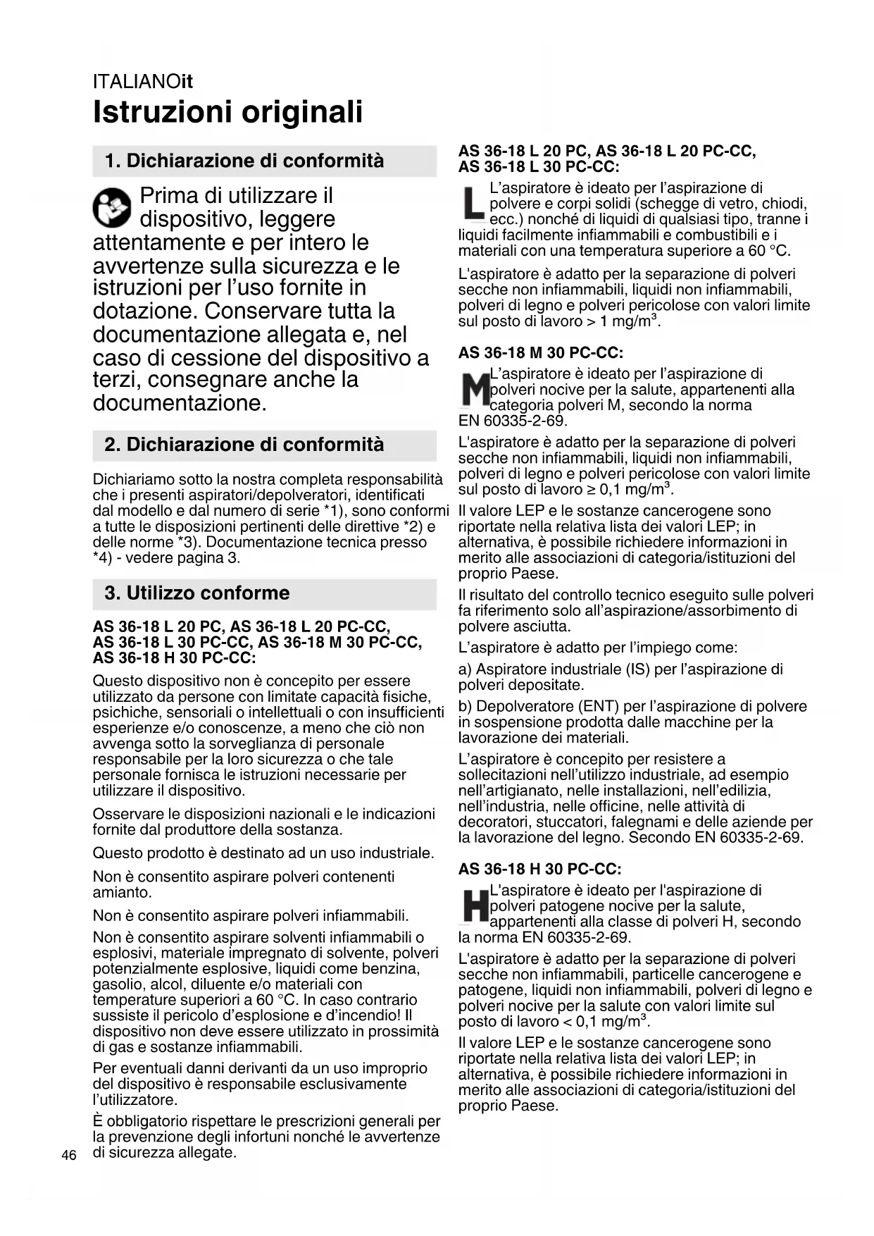 la zona dedicata alla manutenzione. Non mettere in funzione il dispositivo senza l’impianto di filtrazione completo. (Cassette- filtro e sacchetto di smaltimento in PE.) Dal controllo eseguito in conformità alla norma EN 60335 parti 1 e 2-69 è risultato che i requisiti tecnici di sicurezza in riferimento alla sicurezza elettrica sono soddisfatti anche durante l’aspirazione di una miscela di acqua-aria. Avvertenze specifiche di sicurezza per AS 36- 18 H 30 PC-CC: Targhetta di avvertenza per macchine appartenenti alla cate- goria di polveri H: ATTENZIONE! Questo dispositivo contiene polveri nocive per la salute. Gli interventi di svuotamento e manutenzione, inclusa l’eliminazione dei recipienti per la raccolta della polvere, devono essere eseguiti solamente da personale tecnico che indossi i dispositivi di protezione previsti. Non mettere in funzione il dispositivo senza l’impianto di filtrazione completo. Per le operazioni di svuotamento e manutenzione, rispettare le seguenti indicazioni: Pulire il dispositivo prima di aprirlo. Indossare una mascherina antipolvere. Evitare che altre persone entrino in contatto con la polvere. Garantire una ventilazione forzata filtrata in loco. Inoltre pulire la zona dedicata alla manutenzione. Non mettere in funzione il dispositivo senza l’impianto di filtrazione completo. (Cassette- filtro e sacchetto filtrante speciale classe H). Dal controllo eseguito in conformità alla norma EN 60335 parti 1 e 2-69 è risultato che i requisiti tecnici di sicurezza in riferimento alla sicurezza elettrica sono soddisfatti anche durante l’aspirazione di una miscela di acqua-aria. AVVERTENZA - Non utilizzare più le cassette-filtro dopo averle estratte dal dispositivo. Avvertenze specifiche di sicurezza per AS 36-18 L 20 PC, AS 36-18 L 20 PC-CC, AS 36-18 L 30 PC-CC: Targhetta di avvertenza per macchine appartenenti alla cate- goria di polveri L: Il dispositivo è idoneo per l'aspirazione di sostanze lievemente nocive per la salute. Il dispositivo non è idoneo per la riduzione della polvere di legno nell'aria inalata. Le polveri di materiali come vernici contenenti piombo, alcuni tipi di legno, minerali e metalli possono essere dannose per la salute. Il eITALIANOit