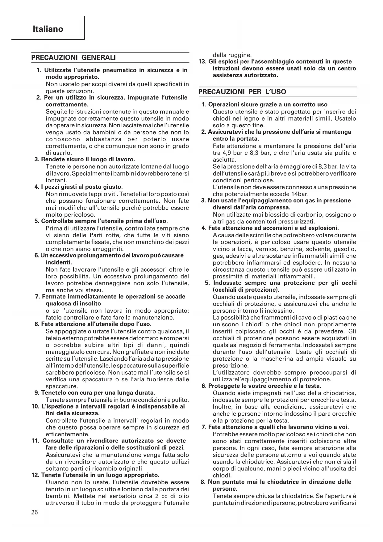 persone. Tenete sempre chiusa la chiodatrice. Se l’apertura è puntata in direzione di persone, potrebbero verificarsi26 Italiano seri incidenti se per errore azionate la chiodatrice. Quando connettete e sconnettete il tubo, durante il caricamento dell’utensile o altre operazioni, assicuratevi che l’apertura della chiodatrice non sia puntata in direzione di persone (inclusi voi stessi). Se la chiodatrice non è caricata, è pericoloso scaricare l’utensile mentre è puntato verso qualcuno. Abbiate cura dell’utensile come uno strumento di lavoro.