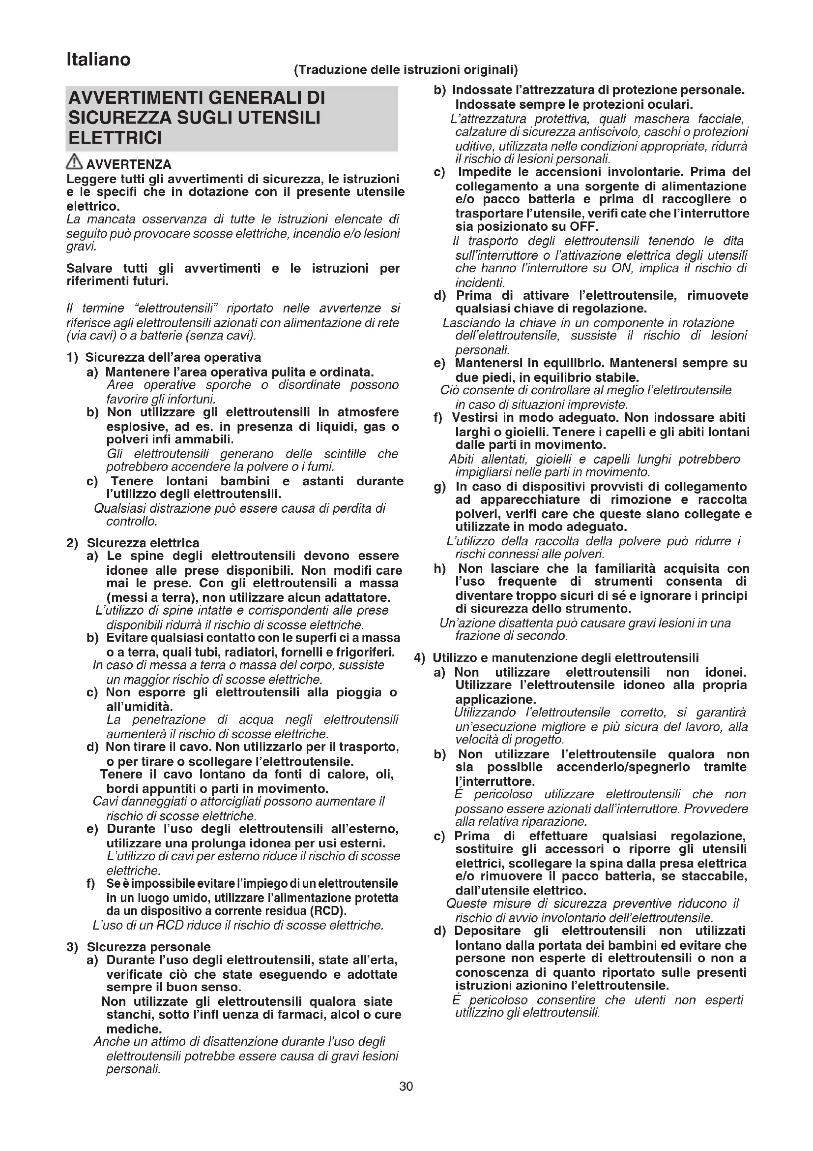 ELETTRICI AVVERTENZA Leggere tutti gli avvertimenti di sicurezza, le istruzioni e le specifi che in dotazione con il presente utensile elettrico. La mancata osservanza di tutte le istruzioni elencate di seguito può provocare scosse elettriche, incendio e/o lesioni gravi. Salvare tutti gli avvertimenti e le istruzioni per riferimenti futuri. Il termine “elettroutensili” riportato nelle avvertenze si riferisce agli elettroutensili azionati con alimentazione di rete (via cavi) o a batterie (senza cavi).