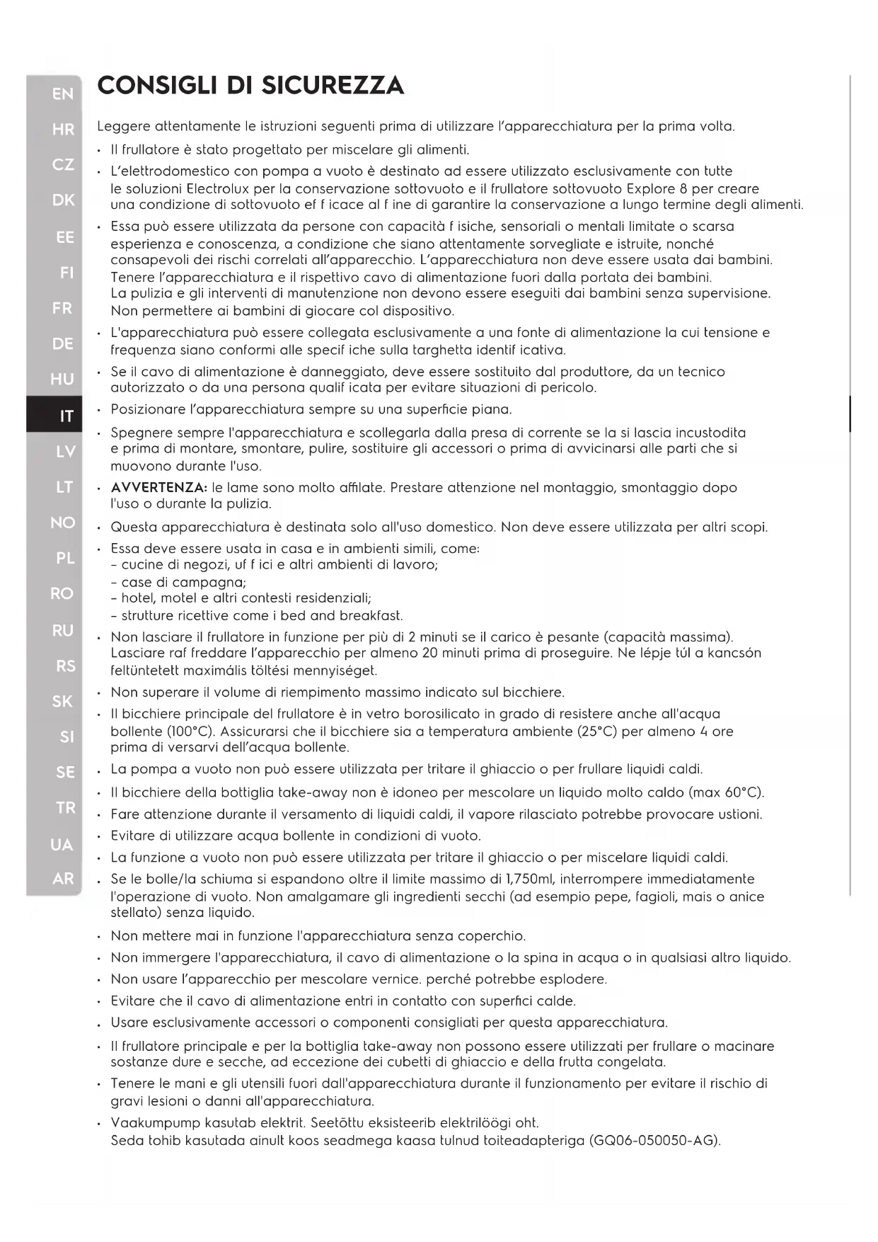 Il frullatore è stato progettato per miscelare gli alimenti. L’elettrodomestico con pompa a vuoto è destinato ad essere utilizzato esclusivamente con tutte le soluzioni Electrolux per la conservazione sottovuoto e il frullatore sottovuoto Explore 8 per creare una condizione di sottovuoto ef f icace al f ine di garantire la conservazione a lungo termine degli alimenti. Essa può essere utilizzata da persone con capacità f isiche, sensoriali o mentali limitate o scarsa esperienza e conoscenza, a condizione che siano attentamente sorvegliate e istruite, nonché consapevoli dei rischi correlati all’apparecchio. L’apparecchiatura non deve essere usata dai bambini. Tenere l’apparecchiatura e il rispettivo cavo di alimentazione fuori dalla portata dei bambini. La pulizia e gli interventi di manutenzione non devono essere eseguiti dai bambini senza supervisione. Non permettere ai bambini di giocare col dispositivo. L'apparecchiatura può essere collegata esclusivamente a una fonte di alimentazione la cui tensione e frequenza siano conformi alle specif iche sulla targhetta identif icativa. Se il cavo di alimentazione è danneggiato, deve essere sostituito dal produttore, da un tecnico autorizzato o da una persona qualif icata per evitare situazioni di pericolo. Posizionare l’apparecchiatura sempre su una superficie piana. Spegnere sempre l'apparecchiatura e scollegarla dalla presa di corrente se la si lascia incustodita e prima di montare, smontare, pulire, sostituire gli accessori o prima di avvicinarsi alle parti che si muovono durante l'uso. AVVERTENZA: le lame sono molto affilate. Prestare attenzione nel montaggio, smontaggio dopo l'uso o durante la pulizia. Questa apparecchiatura è destinata solo all'uso domestico. Non deve essere utilizzata per altri scopi. Essa deve essere usata in casa e in ambienti simili, come: – cucine di negozi, uf f ici e altri ambienti di lavoro; – case di campagna; – hotel, motel e altri contesti residenziali; – strutture ricettive come i bed and breakfast. Non lasciare il frullatore in funzione per più di 2 minuti se il carico è pesante (capacità massima). Lasciare raf freddare l’apparecchio per almeno 20 minuti prima di proseguire. Ne lépje túl a kancsón feltüntetett maximális töltési mennyiséget. Non superare il volume di riempimento massimo indicato sul bicchiere. Il bicchiere principale del frullatore è in vetro borosilicato in grado di resistere anche all'acqua bollente (100°C). Assicurarsi che il bicchiere sia a temperatura ambiente (25°C) per almeno 4 ore prima di versarvi dell’acqua bollente. La pompa a vuoto non può essere utilizzata per tritare il ghiaccio o per frullare liquidi caldi. Il bicchiere della bottiglia take-away non è idoneo per mescolare un liquido molto caldo (max 60°C). Fare attenzione durante il versamento di liquidi caldi, il vapore rilasciato potrebbe provocare ustioni. Evitare di utilizzare acqua bollente in condizioni di vuoto. La funzione a vuoto non può essere utilizzata per tritare il ghiaccio o per miscelare liquidi caldi. Se le bolle/la schiuma si espandono oltre il limite massimo di 1,750ml, interrompere immediatamente l'operazione di vuoto. Non amalgamare gli ingredienti secchi (ad esempio pepe, fagioli, mais o anice stellato) senza liquido. Non mettere mai in funzione l'apparecchiatura senza coperchio. Non immergere l'apparecchiatura, il cavo di alimentazione o la spina in acqua o in qualsiasi altro liquido. Non usare l’apparecchio per mescolare vernice. perché potrebbe esplodere. Evitare che il cavo di alimentazione entri in contatto con superfici calde. Usare esclusivamente accessori o componenti consigliati per questa apparecchiatura. Il frullatore principale e per la bottiglia take-away non possono essere utilizzati per frullare o macinare sostanze dure e secche, ad eccezione dei cubetti di ghiaccio e della frutta congelata. Tenere le mani e gli utensili fuori dall'apparecchiatura durante il funzionamento per evitare il rischio di gravi lesioni o danni all'apparecchiatura. Vaakumpump kasutab elektrit. Seetõttu eksisteerib elektrilöögi oht. Seda tohib kasutada ainult koos seadmega kaasa tulnud toiteadapteriga (GQ06-050050-AG).EN