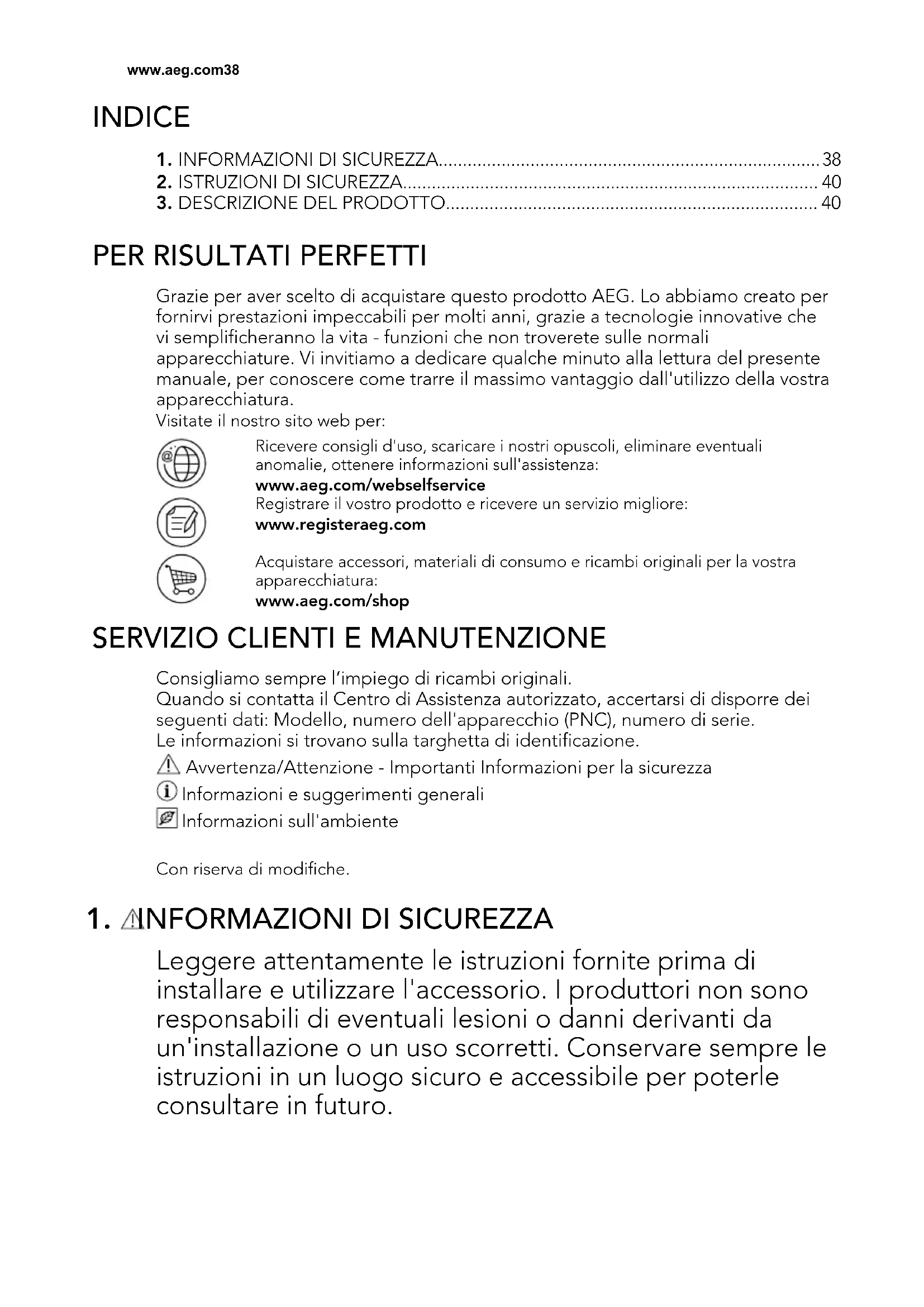 Grazie per aver scelto di acquistare questo prodotto AEG. Lo abbiamo creato per fornirvi prestazioni impeccabili per molti anni, grazie a tecnologie innovative che vi semplificheranno la vita - funzioni che non troverete sulle normali apparecchiature. Vi invitiamo a dedicare qualche minuto alla lettura del presente manuale, per conoscere come trarre il massimo vantaggio dall'utilizzo della vostra apparecchiatura. Visitate il nostro sito web per: Ricevere consigli d'uso, scaricare i nostri opuscoli, eliminare eventuali anomalie, ottenere informazioni sull'assistenza: www.aeg.com/webselfservice Registrare il vostro prodotto e ricevere un servizio migliore: www.registeraeg.com Acquistare accessori, materiali di consumo e ricambi originali per la vostra apparecchiatura: www.aeg.com/shop