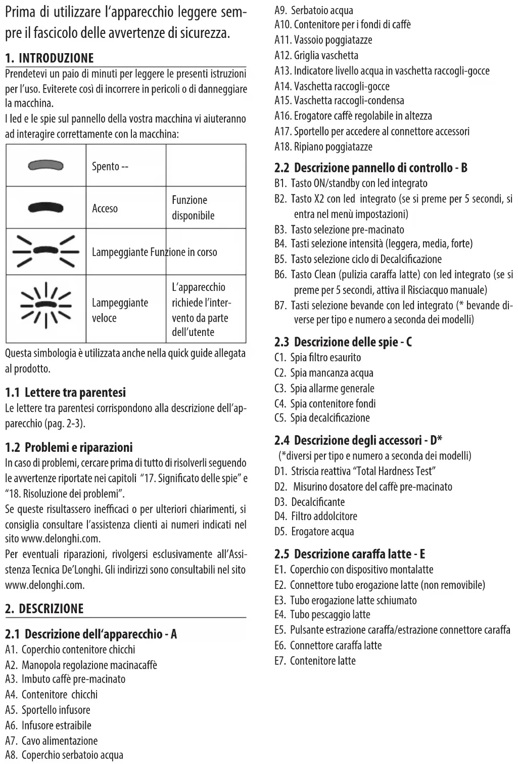 - Si raccomanda di utilizzare esclusivamente decalcicante De’Longhi. L’utilizzo di decalcicanti non idonei, come pure la decalcicazione non regolarmente eseguita, può comportare l’insorgenza di difetti non coperti dalla garan- zia del produttore.