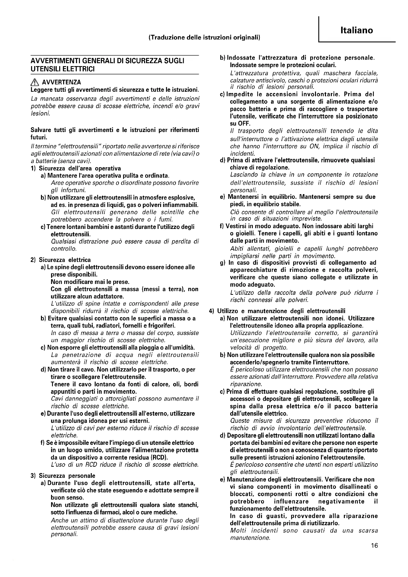 UTENSILI ELETTRICI AVVERTENZA Leggere tutti gli avvertimenti di sicurezza e tutte le istruzioni. La mancata osservanza degli avvertimenti e delle istruzioni potrebbe essere causa di scosse elettriche, incendi e/o gravi lesioni. Salvare tutti gli avvertimenti e le istruzioni per riferimenti futuri. Il termine “elettroutensili” riportato nelle avvertenze si riferisce agli elettroutensili azionati con alimentazione di rete (via cavi) o a batterie (senza cavi).