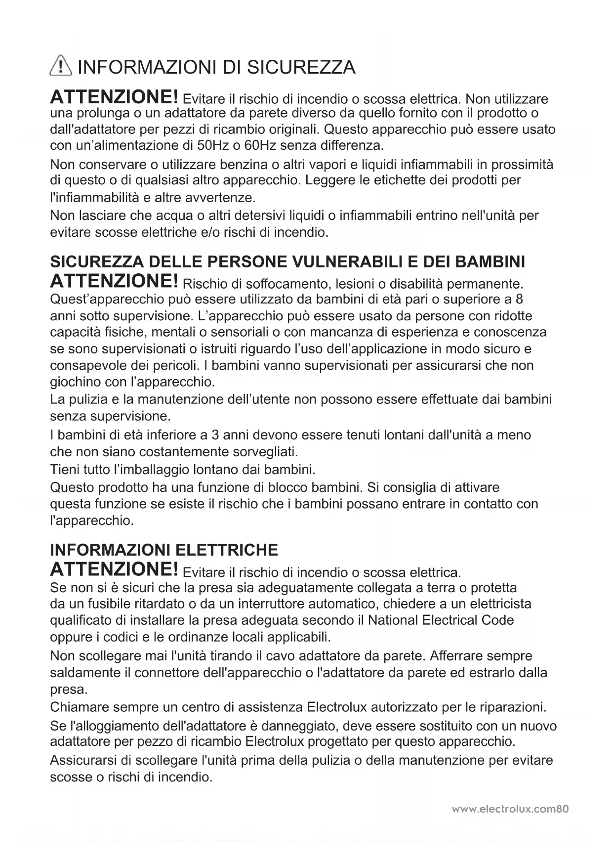 ATTENZIONE! Evitare il rischio di incendio o scossa elettrica. Non utilizzare una prolunga o un adattatore da parete diverso da quello fornito con il prodotto o dall'adattatore per pezzi di ricambio originali. Questo apparecchio può essere usato con un’alimentazione di 50Hz o 60Hz senza dierenza. Non conservare o utilizzare benzina o altri vapori e liquidi inammabili in prossimità di questo o di qualsiasi altro apparecchio. Leggere le etichette dei prodotti per l'inammabilità e altre avvertenze. Non lasciare che acqua o altri detersivi liquidi o inammabili entrino nell'unità per evitare scosse elettriche e/o rischi di incendio. SICUREZZA DELLE PERSONE VULNERABILI E DEI BAMBINI ATTENZIONE! Rischio di soocamento, lesioni o disabilità permanente. Quest’apparecchio può essere utilizzato da bambini di età pari o superiore a 8 anni sotto supervisione. L’apparecchio può essere usato da persone con ridotte capacità siche, mentali o sensoriali o con mancanza di esperienza e conoscenza se sono supervisionati o istruiti riguardo l’uso dell’applicazione in modo sicuro e consapevole dei pericoli. I bambini vanno supervisionati per assicurarsi che non giochino con l’apparecchio. La pulizia e la manutenzione dell’utente non possono essere eettuate dai bambini senza supervisione. I bambini di età inferiore a 3 anni devono essere tenuti lontani dall'unità a meno che non siano costantemente sorvegliati. Tieni tutto l’imballaggio lontano dai bambini. Questo prodotto ha una funzione di blocco bambini. Si consiglia di attivare questa funzione se esiste il rischio che i bambini possano entrare in contatto con l'apparecchio. INFORMAZIONI ELETTRICHE ATTENZIONE! Evitare il rischio di incendio o scossa elettrica. Se non si è sicuri che la presa sia adeguatamente collegata a terra o protetta da un fusibile ritardato o da un interruttore automatico, chiedere a un elettricista qualicato di installare la presa adeguata secondo il National Electrical Code oppure i codici e le ordinanze locali applicabili. Non scollegare mai l'unità tirando il cavo adattatore da parete. Aerrare sempre saldamente il connettore dell'apparecchio o l'adattatore da parete ed estrarlo dalla presa. Chiamare sempre un centro di assistenza Electrolux autorizzato per le riparazioni. Se l'alloggiamento dell'adattatore è danneggiato, deve essere sostituito con un nuovo adattatore per pezzo di ricambio Electrolux progettato per questo apparecchio. Assicurarsi di scollegare l'unità prima della pulizia o della manutenzione per evitare scosse o rischi di incendio.www.electrolux.com 81