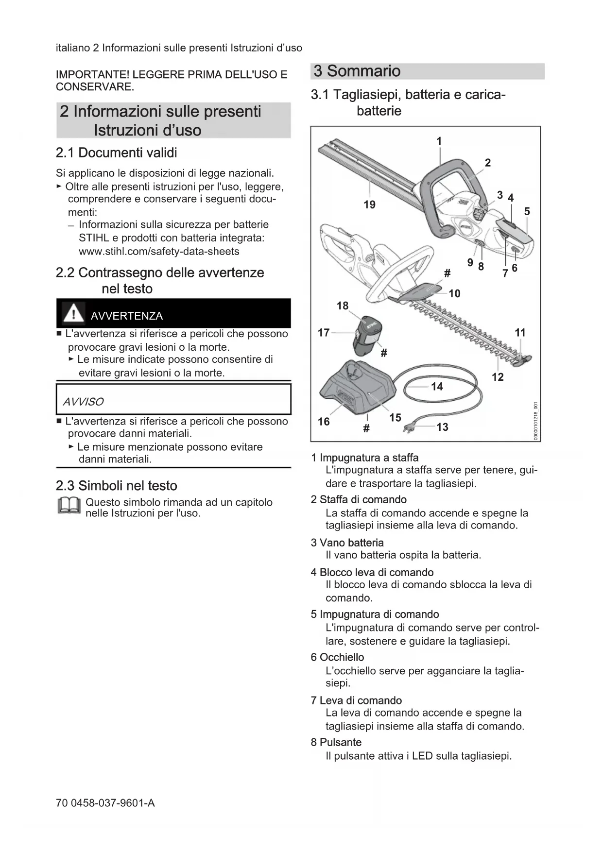 1 Impugnatura a staffa L'impugnatura a staffa serve per tenere, gui‐ dare e trasportare la tagliasiepi. 2 Staffa di comando La staffa di comando accende e spegne la tagliasiepi insieme alla leva di comando. 3 Vano batteria Il vano batteria ospita la batteria. 4 Blocco leva di comando Il blocco leva di comando sblocca la leva di comando. 5 Impugnatura di comando L'impugnatura di comando serve per control‐ lare, sostenere e guidare la tagliasiepi. 6 Occhiello L’occhiello serve per agganciare la taglia‐ siepi. 7 Leva di comando La leva di comando accende e spegne la tagliasiepi insieme alla staffa di comando. 8 Pulsante Il pulsante attiva i LED sulla tagliasiepi. italiano 2 Informazioni sulle presenti Istruzioni d’uso