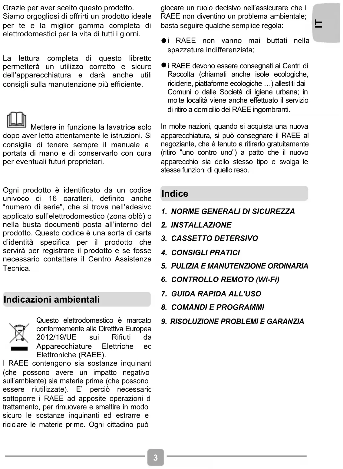 Mettere in funzione la lavatrice solo dopo aver letto attentamente le istruzioni. Si consiglia di tenere sempre il manuale a portata di mano e di conservarlo con cura per eventuali futuri proprietari.