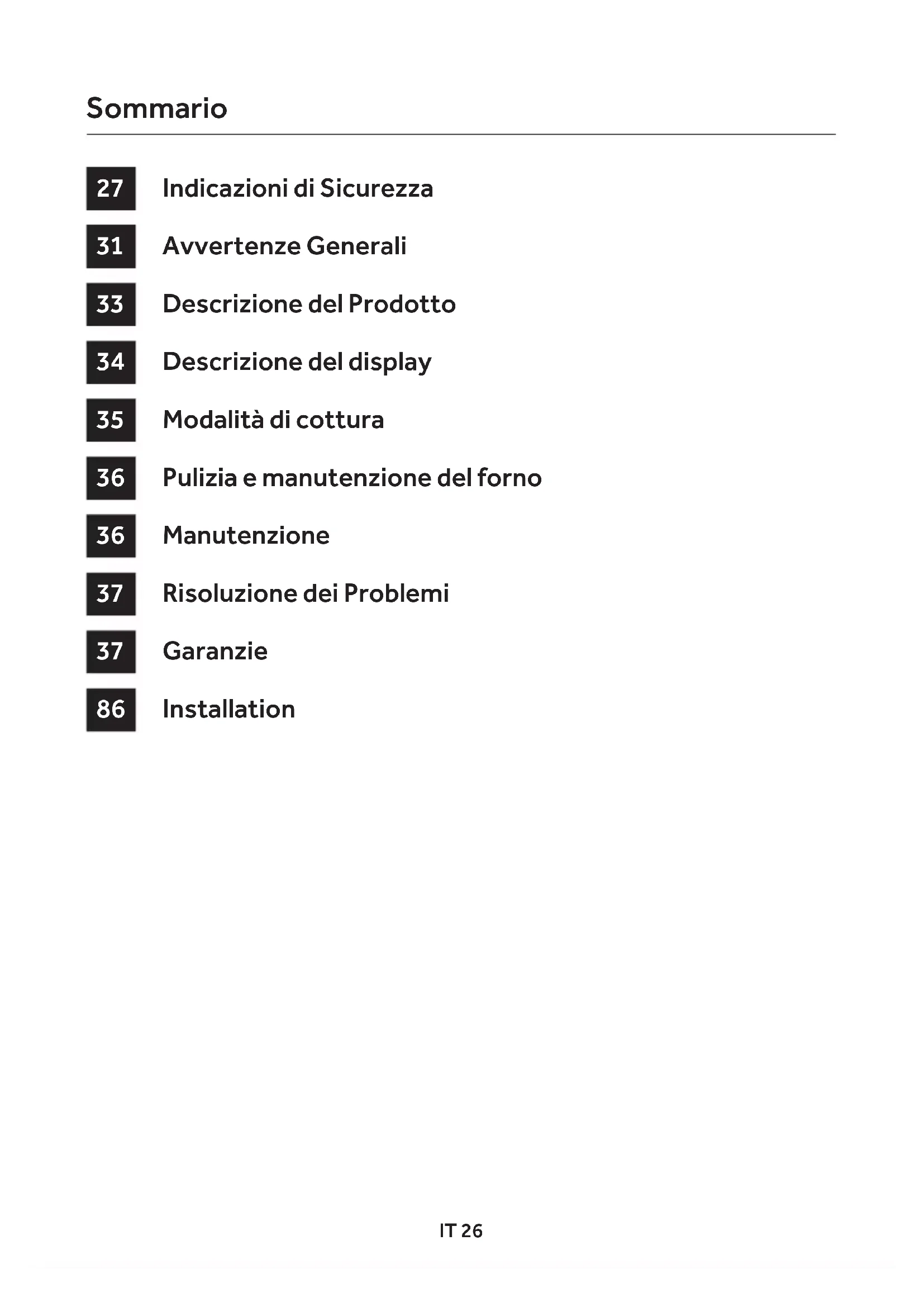 Ove possibile, evitare di pre-riscaldare il forno e cercare sempre di riempirlo. Aprire la porta del forno quanto necessario, perché vi sono disper- sioni di calore ogni volta che viene aperta. Per ris- parmiare molta energia sarà suciente spegnere il forno dai 5 ai 10 minuti prima della fine del tem- po di cottura pianificato, e servirsi del calore che il forno continua a generare. Tenere le guarnizioni pulite e in ordine, per evitare eventuali dispersioni di energia. Se si dispone di un contratto di ener- gia elettrica a taria oraria, il programma “cottura ritardata” renderà più semplice il risparmio spo- stando l’avvio del programma negli orari a taria ridotta.ES 38 Indicaciones de seguridad Advertencias Generales Descripción del producto Descripción general Modalidades de cocción Limpieza y mantenimiento del horno Mantenimiento Solución de problemas Installation Índice