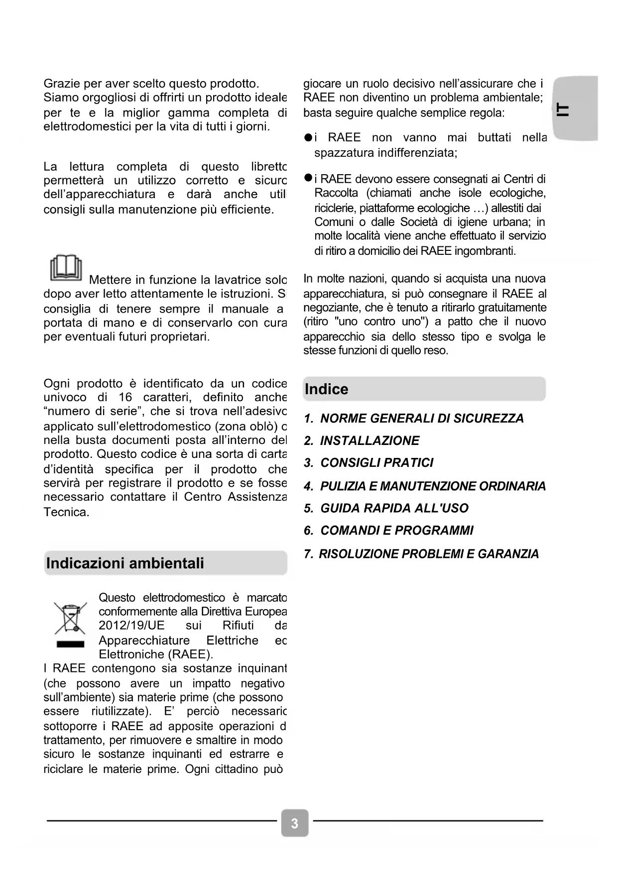 Mettere in funzione la lavatrice solo dopo aver letto attentamente le istruzioni. Si consiglia di tenere sempre il manuale a portata di mano e di conservarlo con cura per eventuali futuri proprietari.