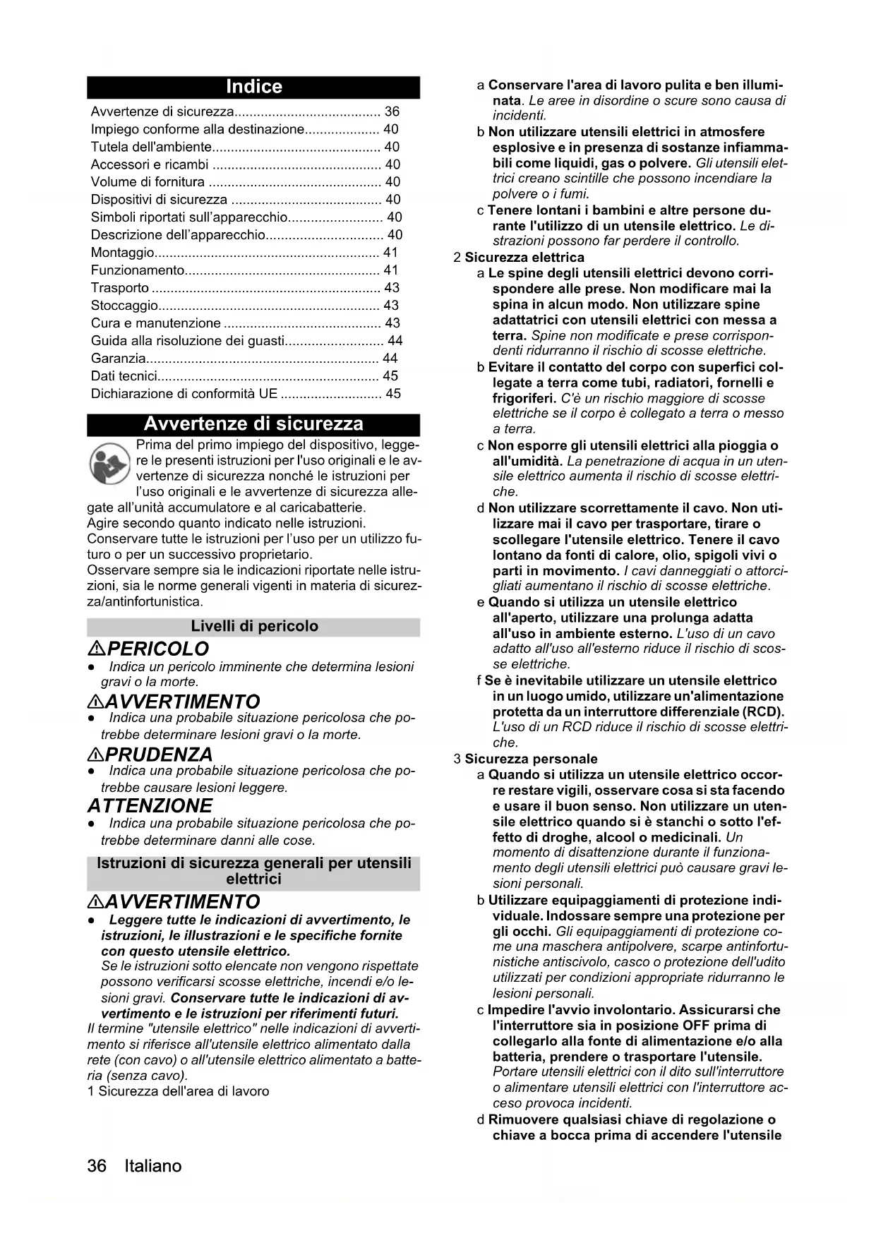 - garanti dB(A) 82 Dimensions et poids Poids avec cisaille à gazon kg 0,58 Poids avec sculpte-haies kg 0,63 Longueur x largeur x hauteur (avec cisaille à gazon, sans bloc- batterie, sans protège-lame) mm 306 x 83 x 132 Longueur x largeur x hauteur (avec sculpte-haies, sans bloc- batterie, sans protège-lame) mm 392 x 81 x 13236 Italiano Indice Avvertenze di sicurezza Prima del primo impiego del dispositivo, legge- re le presenti istruzioni per l'uso originali e le av- vertenze di sicurezza nonché le istruzioni per l’uso originali e le avvertenze di sicurezza alle- gate all’unità accumulatore e al caricabatterie. Agire secondo quanto indicato nelle istruzioni. Conservare tutte le istruzioni per l’uso per un utilizzo fu- turo o per un successivo proprietario. Osservare sempre sia le indicazioni riportate nelle istru- zioni, sia le norme generali vigenti in materia di sicurez- za/antinfortunistica. Livelli di pericolo PERICOLO ● Indica un pericolo imminente che determina lesioni gravi o la morte. 몇 AVVERTIMENTO ● Indica una probabile situazione pericolosa che po- trebbe determinare lesioni gravi o la morte. 몇 PRUDENZA ● Indica una probabile situazione pericolosa che po- trebbe causare lesioni leggere. ATTENZIONE ● Indica una probabile situazione pericolosa che po- trebbe determinare danni alle cose. Istruzioni di sicurezza generali per utensili elettrici 몇 AVVERTIMENTO ● Leggere tutte le indicazioni di avvertimento, le istruzioni, le illustrazioni e le specifiche fornite con questo utensile elettrico. Se le istruzioni sotto elencate non vengono rispettate possono verificarsi scosse elettriche, incendi e/o le- sioni gravi. Conservare tutte le indicazioni di av- vertimento e le istruzioni per riferimenti futuri. Il termine "utensile elettrico" nelle indicazioni di avverti- mento si riferisce all'utensile elettrico alimentato dalla rete (con cavo) o all'utensile elettrico alimentato a batte- ria (senza cavo). 1 Sicurezza dell'area di lavoro a Conservare l'area di lavoro pulita e ben illumi- nata. Le aree in disordine o scure sono causa di incidenti. b Non utilizzare utensili elettrici in atmosfere esplosive e in presenza di sostanze infiamma- bili come liquidi, gas o polvere. Gli utensili elet- trici creano scintille che possono incendiare la polvere o i fumi. c Tenere lontani i bambini e altre persone du- rante l'utilizzo di un utensile elettrico. Le di- strazioni possono far perdere il controllo. 2 Sicurezza elettrica a Le spine degli utensili elettrici devono corri- spondere alle prese. Non modificare mai la spina in alcun modo. Non utilizzare spine adattatrici con utensili elettrici con messa a terra. Spine non modificate e prese corrispon- denti ridurranno il rischio di scosse elettriche. b Evitare il contatto del corpo con superfici col- legate a terra come tubi, radiatori, fornelli e frigoriferi. C'è un rischio maggiore di scosse elettriche se il corpo è collegato a terra o messo a terra. c Non esporre gli utensili elettrici alla pioggia o all'umidità. La penetrazione di acqua in un uten- sile elettrico aumenta il rischio di scosse elettri- che. d Non utilizzare scorrettamente il cavo. Non uti- lizzare mai il cavo per trasportare, tirare o scollegare l'utensile elettrico. Tenere il cavo lontano da fonti di calore, olio, spigoli vivi o parti in movimento. I cavi danneggiati o attorci- gliati aumentano il rischio di scosse elettriche. e Quando si utilizza un utensile elettrico all'aperto, utilizzare una prolunga adatta all'uso in ambiente esterno. L'uso di un cavo adatto all'uso all'esterno riduce il rischio di scos- se elettriche. f Se è inevitabile utilizzare un utensile elettrico in un luogo umido, utilizzare un'alimentazione protetta da un interruttore differenziale (RCD). L'uso di un RCD riduce il rischio di scosse elettri- che. 3 Sicurezza personale a Quando si utilizza un utensile elettrico occor- re restare vigili, osservare cosa si sta facendo e usare il buon senso. Non utilizzare un uten- sile elettrico quando si è stanchi o sotto l'ef- fetto di droghe, alcool o medicinali. Un momento di disattenzione durante il funziona- mento degli utensili elettrici può causare gravi le- sioni personali. b Utilizzare equipaggiamenti di protezione indi- viduale. Indossare sempre una protezione per gli occhi. Gli equipaggiamenti di protezione co- me una maschera antipolvere, scarpe antinfortu- nistiche antiscivolo, casco o protezione dell'udito utilizzati per condizioni appropriate ridurranno le lesioni personali. c Impedire l'avvio involontario. Assicurarsi che l'interruttore sia in posizione OFF prima di collegarlo alla fonte di alimentazione e/o alla batteria, prendere o trasportare l'utensile. Portare utensili elettrici con il dito sull'interruttore o alimentare utensili elettrici con l'interruttore ac- ceso provoca incidenti. d Rimuovere qualsiasi chiave di regolazione o chiave a bocca prima di accendere l'utensile Avvertenze di sicurezza p. 36