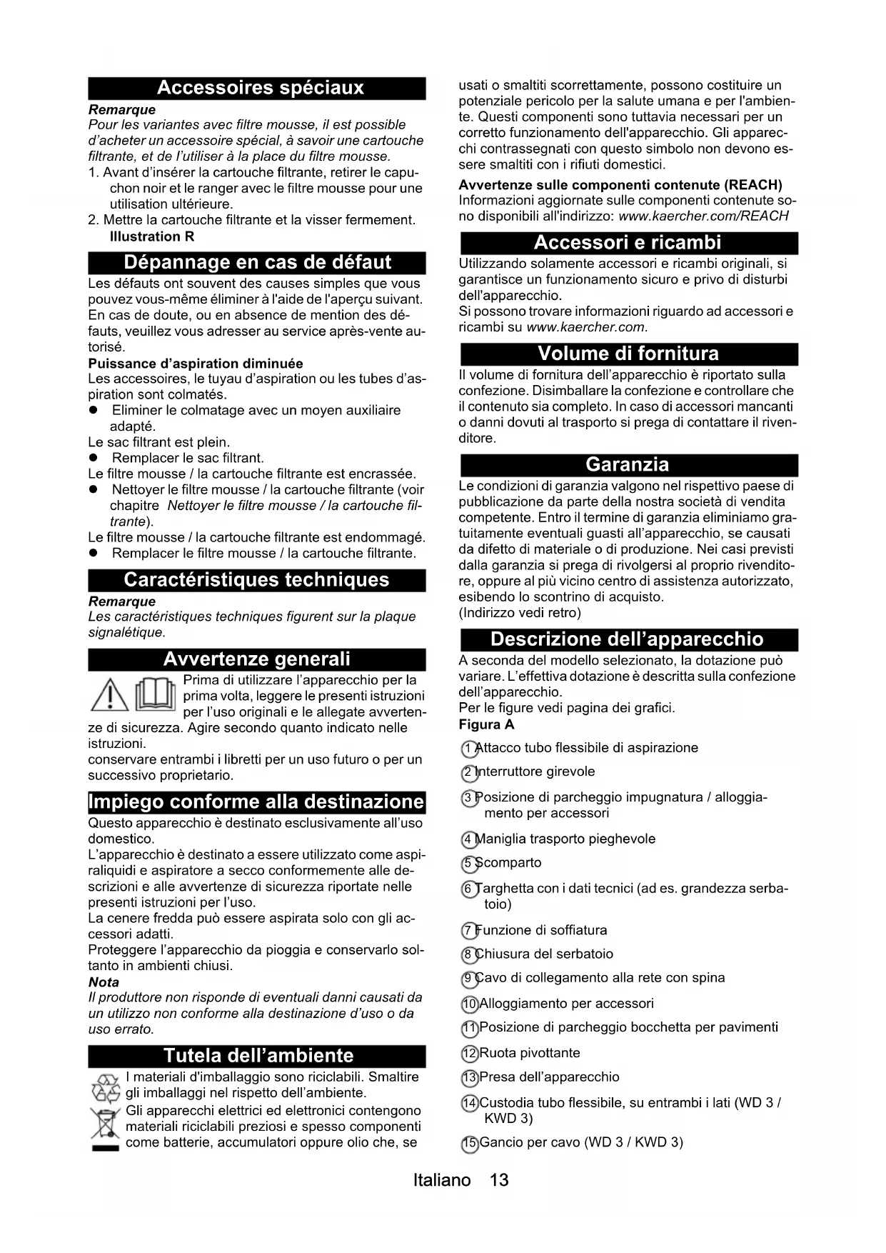 Illustration R Dépannage en cas de défaut Les défauts ont souvent des causes simples que vous pouvez vous-même éliminer à l'aide de l'aperçu suivant. En cas de doute, ou en absence de mention des dé- fauts, veuillez vous adresser au service après-vente au- torisé. Puissance d’aspiration diminuée Les accessoires, le tuyau d’aspiration ou les tubes d’as- piration sont colmatés. Eliminer le colmatage avec un moyen auxiliaire adapté. Le sac filtrant est plein. Remplacer le sac filtrant. Le filtre mousse / la cartouche filtrante est encrassée. Nettoyer le filtre mousse / la cartouche filtrante (voir chapitre Nettoyer le filtre mousse / la cartouche fil- trante). Le filtre mousse / la cartouche filtrante est endommagé. Remplacer le filtre mousse / la cartouche filtrante. Caractéristiques techniques Remarque Les caractéristiques techniques figurent sur la plaque signalétique. Avvertenze generali Prima di utilizzare l’apparecchio per la prima volta, leggere le presenti istruzioni per l’uso originali e le allegate avverten- ze di sicurezza. Agire secondo quanto indicato nelle istruzioni. conservare entrambi i libretti per un uso futuro o per un successivo proprietario. Impiego conforme alla destinazione Questo apparecchio è destinato esclusivamente all’uso domestico. L’apparecchio è destinato a essere utilizzato come aspi- raliquidi e aspiratore a secco conformemente alle de- scrizioni e alle avvertenze di sicurezza riportate nelle presenti istruzioni per l’uso. La cenere fredda può essere aspirata solo con gli ac- cessori adatti. Proteggere l’apparecchio da pioggia e conservarlo sol- tanto in ambienti chiusi. Nota Il produttore non risponde di eventuali danni causati da un utilizzo non conforme alla destinazione d’uso o da uso errato. Tutela dell’ambiente I materiali d'imballaggio sono riciclabili. Smaltire gli imballaggi nel rispetto dell’ambiente. Gli apparecchi elettrici ed elettronici contengono materiali riciclabili preziosi e spesso componenti come batterie, accumulatori oppure olio che, se usati o smaltiti scorrettamente, possono costituire un potenziale pericolo per la salute umana e per l'ambien- te. Questi componenti sono tuttavia necessari per un corretto funzionamento dell'apparecchio. Gli apparec- chi contrassegnati con questo simbolo non devono es- sere smaltiti con i rifiuti domestici. Avvertenze sulle componenti contenute (REACH) Informazioni aggiornate sulle componenti contenute so- no disponibili all'indirizzo: www.kaercher.com/REACH Accessori e ricambi Utilizzando solamente accessori e ricambi originali, si garantisce un funzionamento sicuro e privo di disturbi dell'apparecchio. Si possono trovare informazioni riguardo ad accessori e ricambi su www.kaercher.com. Volume di fornitura Il volume di fornitura dell’apparecchio è riportato sulla confezione. Disimballare la confezione e controllare che il contenuto sia completo. In caso di accessori mancanti o danni dovuti al trasporto si prega di contattare il riven- ditore. Garanzia Le condizioni di garanzia valgono nel rispettivo paese di pubblicazione da parte della nostra società di vendita competente. Entro il termine di garanzia eliminiamo gra- tuitamente eventuali guasti all’apparecchio, se causati da difetto di materiale o di produzione. Nei casi previsti dalla garanzia si prega di rivolgersi al proprio rivendito- re, oppure al più vicino centro di assistenza autorizzato, esibendo lo scontrino di acquisto. (Indirizzo vedi retro) Descrizione dell’apparecchio A seconda del modello selezionato, la dotazione può variare. L’effettiva dotazione è descritta sulla confezione dell’apparecchio. Per le figure vedi pagina dei grafici. Figura A 1 Attacco tubo flessibile di aspirazione 2 Interruttore girevole 3 Posizione di parcheggio impugnatura / alloggia- mento per accessori 4 Maniglia trasporto pieghevole 5 Scomparto 6 Targhetta con i dati tecnici (ad es. grandezza serba- toio) 7 Funzione di soffiatura 8 Chiusura del serbatoio 9 Cavo di collegamento alla rete con spina 10 Alloggiamento per accessori 11 Posizione di parcheggio bocchetta per pavimenti 12 Ruota pivottante 13 Presa dell’apparecchio 14 Custodia tubo flessibile, su entrambi i lati (WD 3 / KWD 3) 15 Gancio per cavo (WD 3 / KWD 3)14 Italiano 16 Sacchetto filtro17 Filtro in materiale espanso18 Filtro a cartuccia19 Tubo flessibile di aspirazione (WD 2 Plus / KWD 2)20 Impugnatura estraibile (WD 3 / KWD 3)21 Tubo flessibile di aspirazione con raccordo (WD 3 / KWD 3) 22 Tubi di aspirazione 2 x 0,5 m23 Bocchetta fessure 24 Bocchetta per pavimenti25 Adattatore per il collegamento di utensili elettrici Montaggio delle ruote orientabili