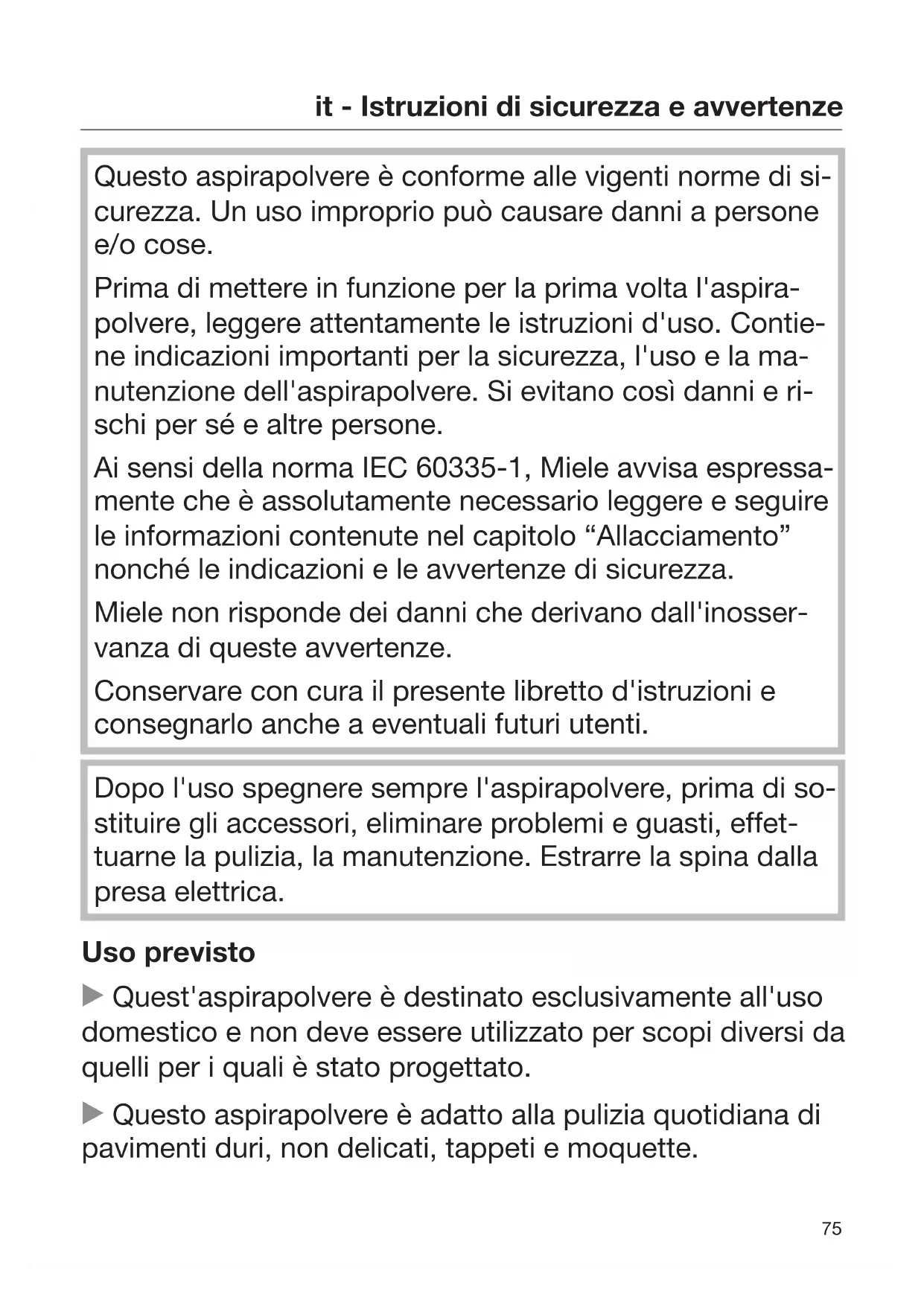 Questo aspirapolvere è conforme alle vigenti norme di si- curezza. Un uso improprio può causare danni a persone e/o cose. Prima di mettere in funzione per la prima volta l'aspira- polvere, leggere attentamente le istruzioni d'uso. Contie- ne indicazioni importanti per la sicurezza, l'uso e la ma- nutenzione dell'aspirapolvere. Si evitano così danni e ri- schi per sé e altre persone. Ai sensi della norma IEC 60335-1, Miele avvisa espressa- mente che è assolutamente necessario leggere e seguire le informazioni contenute nel capitolo “Allacciamento” nonché le indicazioni e le avvertenze di sicurezza. Miele non risponde dei danni che derivano dall'inosser- vanza di queste avvertenze. Conservare con cura il presente libretto d'istruzioni e consegnarlo anche a eventuali futuri utenti. Dopo l'uso spegnere sempre l'aspirapolvere, prima di so- stituire gli accessori, eliminare problemi e guasti, effet- tuarne la pulizia, la manutenzione. Estrarre la spina dalla presa elettrica. Uso previsto Quest'aspirapolvere è destinato esclusivamente all'uso domestico e non deve essere utilizzato per scopi diversi da quelli per i quali è stato progettato. Questo aspirapolvere è adatto alla pulizia quotidiana di pavimenti duri, non delicati, tappeti e moquette.it - Istruzioni di sicurezza e avvertenze