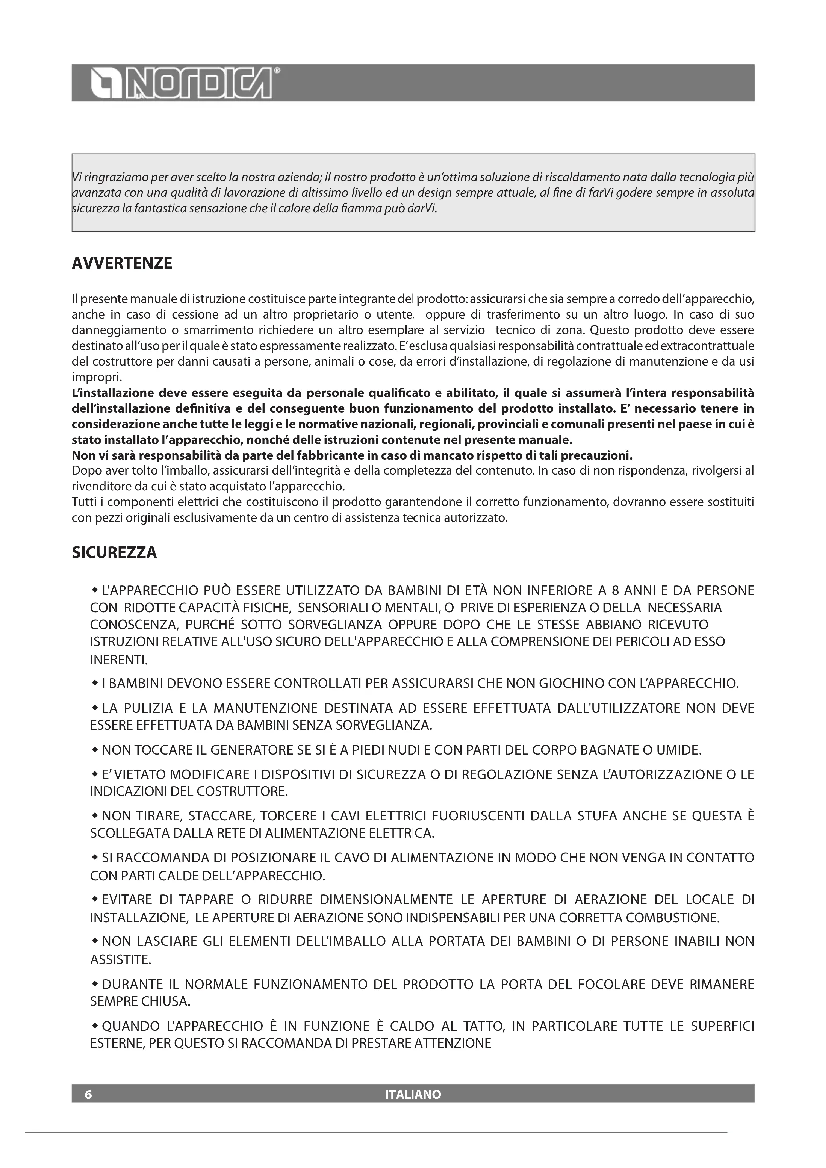 Le operazioni di pulizia periodica, come indicato nel presente manuale uso e manutenzione, devono essere eseguite prestando la massima cura dopo aver letto le indicazioni, le procedure e le tempistiche descritte nel presente manuale uso e manutenzione. Controllare e pulire, almeno una volta all’anno, la presa d’aria esterna. Il camino deve essere regolarmente ramazzato dallo spazzacamino. Fate controllare dal Vostro spazzacamino responsabile di zona la regolare installazione del prodotto, il collegamento al camino e l’aerazione. IMPORTANTE: LA PULIZIA E LA MANUTENZIONE DEVE ESSERE ESEGUITA ESCLUSIVAMENTE AD APPARECCHIO FREDDO. Si possono usare esclusivamente parti di ricambio espressamente autorizzate ed oerte da La NORDICA S.p.A. In caso di bisogno Vi preghiamo di rivolgerVi al Vs rivenditore specializzato. L’ APPARECCHIO NON PUÒ ESSERE MODIFICATO! PULIZIA VETRO Tramite uno specico ingresso dell’aria secondaria la formazione di deposito di sporco, sul vetro della porta, viene ecacemente rallentata. Non può comunque mai essere evitata con l’utilizzo dei combustibili solidi (es. legna umida ) e questo non è da considerarsi come un difetto dell’apparecchio . IMPORTANTE: la pulizia del vetro panoramico deve essere eseguita solo ed esclusivamente a apparecchio freddo per evitarne l’esplosione. Per la pulizia si possono usare dei prodotti specici oppure, con una palla di carta di giornale (quotidiano) inumidita e passata nella cenere. Non usare comunque panni, o prodotti abrasivi o chimicamente aggressivi. 14ITALIANO La corretta procedura di accensione, l’utilizzo di quantità e tipi di combustibili idonei, il corretto posizionamento del registro dell’aria secondaria, il suciente tiraggio del camino e la presenza dell’aria comburente sono indispensabili per il funzionamento ottimale dell’apparecchio e per mantenere pulito il vetro. ROTTURA DEI VETRI: i vetri essendo in vetroceramica resistenti no ad uno sbalzo termico di 750°C, non sono soggetti a shock termici. La loro rottura può essere causata solo da shock meccanici (urti o chiusura violenta della porta ecc.). Pertanto la sostituzione non è in garanzia.