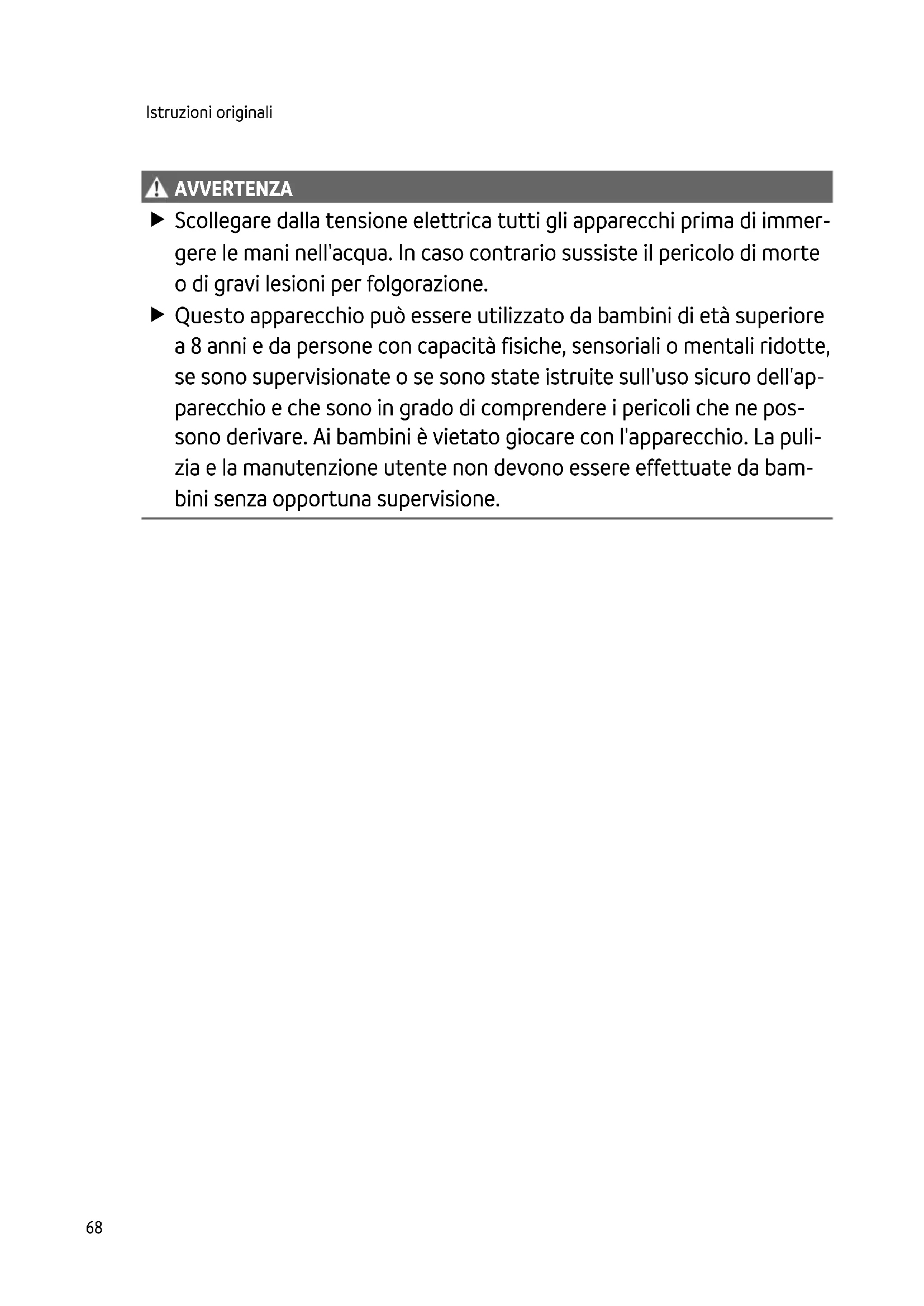 AVVERTENZA Scollegare dalla tensione elettrica tutti gli apparecchi prima di immer- gere le mani nell'acqua. In caso contrario sussiste il pericolo di morte o di gravi lesioni per folgorazione. Questo apparecchio può essere utilizzato da bambini di età superiore a 8 anni e da persone con capacità fisiche, sensoriali o mentali ridotte, se sono supervisionate o se sono state istruite sull'uso sicuro dell'ap- parecchio e che sono in grado di comprendere i pericoli che ne pos- sono derivare. Ai bambini è vietato giocare con l'apparecchio. La puli- zia e la manutenzione utente non devono essere effettuate da bam- bini senza opportuna supervisione.IT
