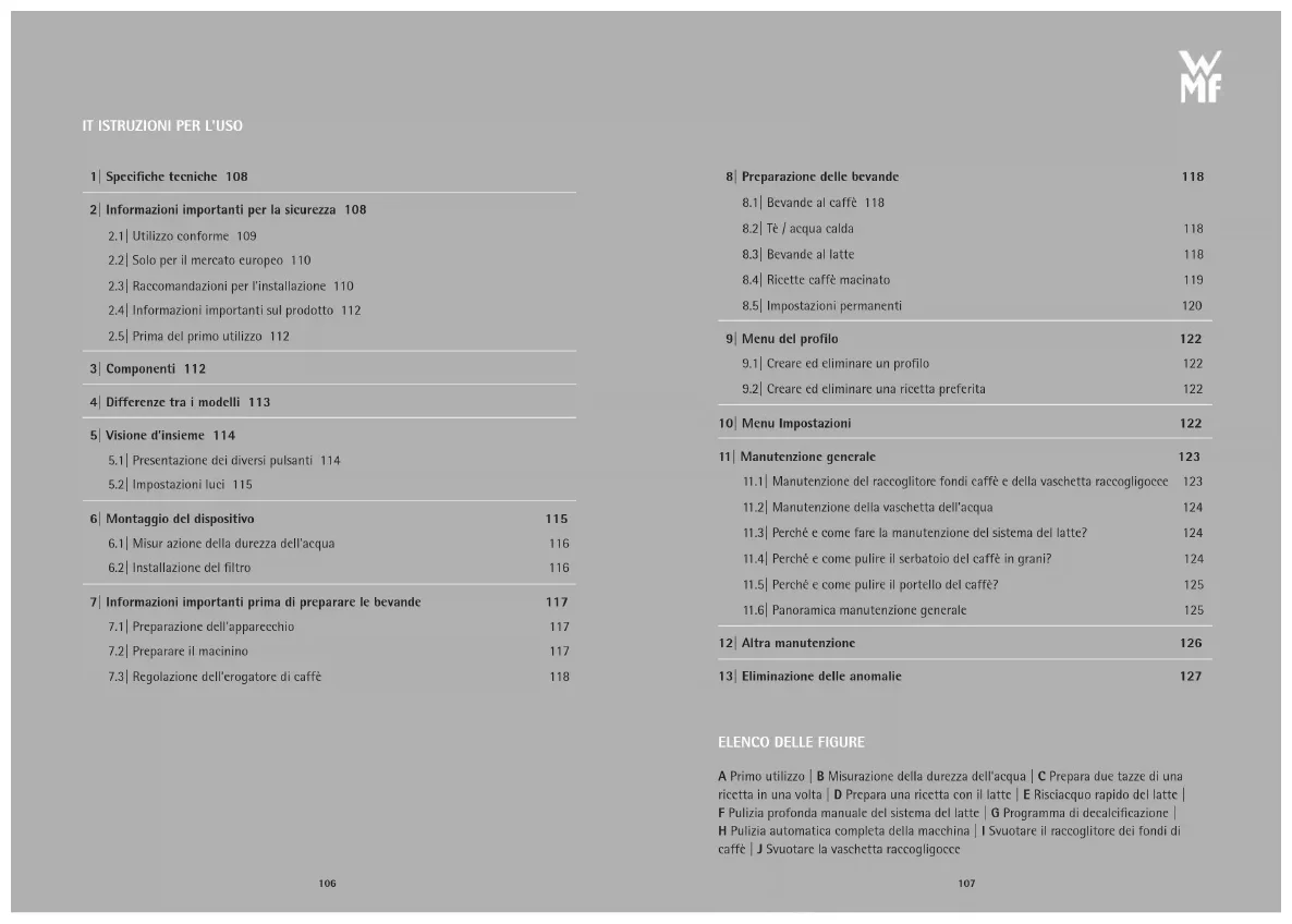TR SV RU RO PT PL NO NL FI DA CS IT ES FR EN DEIT ISTRUZIONI PER L’USO 1|Specifiche tecniche 108 2|Informazioni importanti per la sicurezza 108 2.1|Utilizzo conforme 109 2.2|Solo per il mercato europeo 110 2.3|Raccomandazioni per l’installazione 110 2.4|Informazioni importanti sul prodotto 112 2.5|Prima del primo utilizzo 112 3|Componenti 112 4|Differenze tra i modelli 113 5|Visione d’insieme 114 5.1|Presentazione dei diversi pulsanti 114 5.2|Impostazioni luci 115 6|Montaggio del dispositivo 115 6.1|Misur azione della durezza dell’acqua 116 6.2|Installazione del filtro 116 7|Informazioni importanti prima di preparare le bevande 117 7.1|Preparazione dell’apparecchio 117 7.2|Preparare il macinino 117 7.3|Regolazione dell’erogatore di caffè 118 8|Preparazione delle bevande 118 8.1|Bevande al caffè 118 8.2|Tè / acqua calda 118 8.3|Bevande al latte 118 8.4|Ricette caffè macinato 119 8.5|Impostazioni permanenti 120 9|Menu del profilo 122 9.1|Creare ed eliminare un profilo 122 9.2|Creare ed eliminare una ricetta preferita 122 10|Menu Impostazioni 122 11|Manutenzione generale 123 11.1|Manutenzione del raccoglitore fondi caffè e della vaschetta raccogligocce 123 11.2|Manutenzione della vaschetta dell’acqua 124 11.3|Perché e come fare la manutenzione del sistema del latte? 124 11.4|Perché e come pulire il serbatoio del caffè in grani? 124 11.5|Perché e come pulire il portello del caffè? 125 11.6|Panoramica manutenzione generale 125 12|Altra manutenzione 126 13|Eliminazione delle anomalie 127