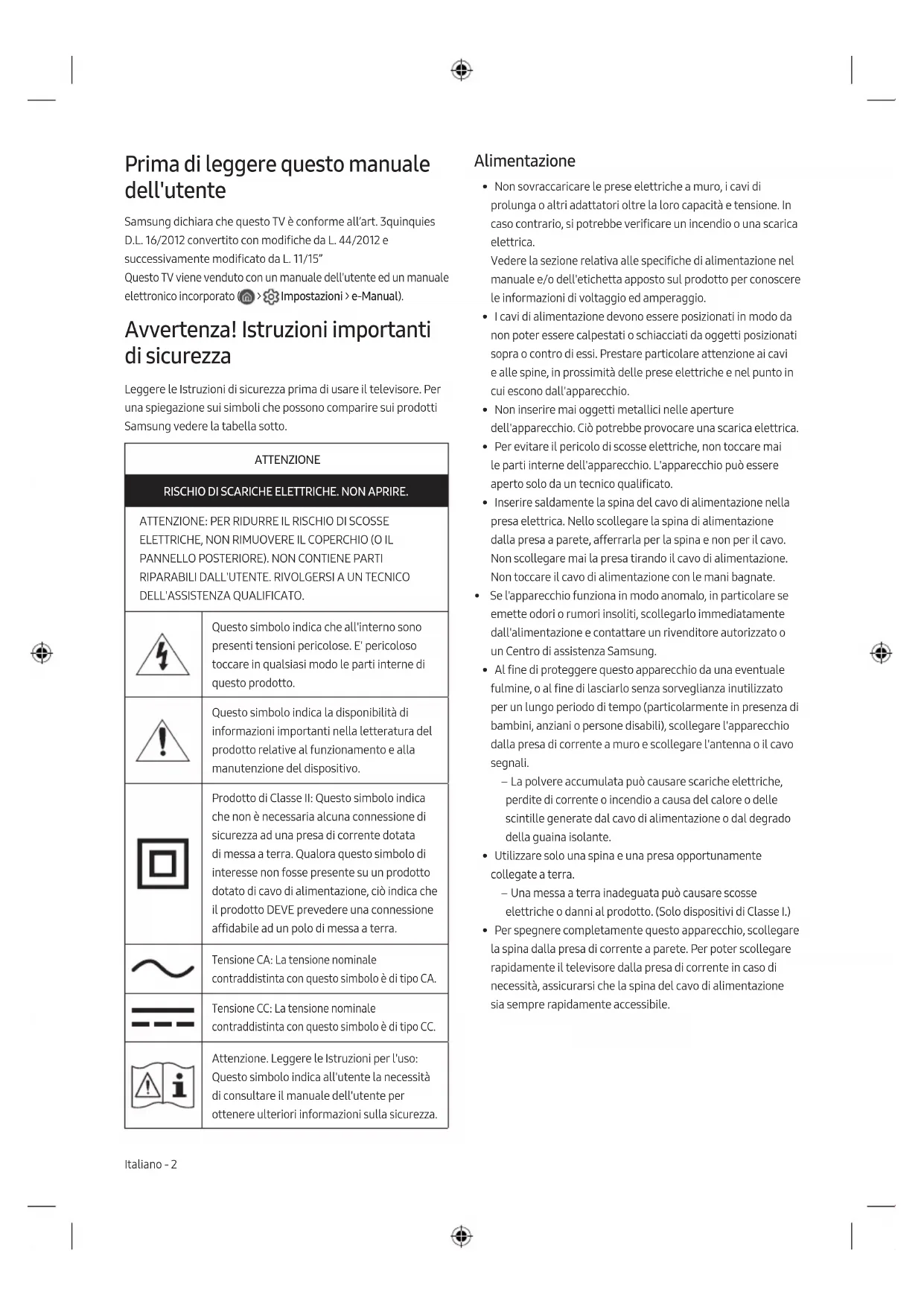- Le figure e le illustrazioni presenti in questo Manuale dell'utente sono fornite unicamente a titolo di riferimento e possono differire da quelle del prodotto attuale. Le specifiche e il design del prodotto possono variare senza preavviso. Samsung non potrà essere ritenuta responsabile per danni a cose e persone o per problematiche legate alla sicurezza dovute a riparazioni non effettuate da Samsung o da un fornitore di servizi autorizzato da Samsung in accordo con le linee guida dell'azienda relative alla riparazione ed alla manutenzione dei propri prodotti. Qualsiasi danno causato al prodotto da personale non autorizzato durante un tentativo di riparazione non potrà essere coperto dalla garanzia convenzionale. Si prega gentilmente di visitare il sito samsung.com/support per ulteriori informazioni sull'adattatore di alimentazione esterno e sul telecomando associati alla direttiva UE sulla progettazione ecocompatibile - Regolamento ErP Riduzione del consumo energetico Quando si spegne, il televisore entra in modalità Standby. In modalità Standby continua a consumare una piccola quantità di energia. Per ridurre il consumo energetico, scollegare il cavo di alimentazione dalla presa a parete in caso di inutilizzo prolungato del televisore. Licenze The terms HDMI and HDMI High-Definition Multimedia Interface, and the HDMI Logo are trademarks or registered trademarks of HDMI Licensing Administrator, Inc. in the United States and other countries. Con la presente, Samsung dichiara che questo dispositivo radio è conforme ai requisiti essenziali della Direttiva 2014/53/UE e ad altre disposizioni pertinenti nel Regno Unito. Il testo completo della Dichiarazione di conformità è disponibile al seguente indirizzo internet: http://www.samsung.com accedere a Supporto e digitare il nome del modello. L'uso di questo apparecchio è consentito in tutti i paesi europei e nel Regno Unito. La funzione 5 GHz WLAN(Wi-Fi) di questo prodotto può essere utilizzata solo in interno. Max potenza trasmissione BT: 100mW a 2,4GHz – 2,4835GHz Max potenza trasmissione Wi-Fi: 100mW a 2,4GHz-2,4835GHz, 200mW a 5,15GHz-5,25GHz, 100mW 5,25GHz-5,35GHz & 5,47GHz - 5,725GHz Italiano - 7 ItalianoCorretto smaltimento delle batterie del prodotto (Applicabile nei Paesi con sistemi di raccolta differenziata) Il simbolo riportato sulla pila, sull’accumulatore o sul pacco batterie o sulla sua documentazione o confezione (un bidone della spazzatura con ruote barrato da una croce) indica che la batteria, l’accumulatore o il pacco batteria non deve essere smaltito insieme al rifiuto urbano indifferenziato ma deve essere raccolto separatamente in modo da permetterne il trattamento, il riciclaggio e lo smaltimento in conformità alla normativa vigente, evitando in questo modo potenziali danni alla salute umana e all’ambiente. L’utilizzatore ha, quindi, un ruolo attivo nel riciclaggio di pile e accumulatori, potendo disfarsi dei relativi rifiuti nel più vicino punto di raccolta – organizzato e gestito in conformità alla normativa vigente – senza oneri e senza l’obbligo di acquistare nuove pile o nuovi accumulatori. L’eventuale presenza, sotto il simbolo del bidone della spazzatura con ruote barrato da una croce, del simbolo chimico Hg, Cd o Pb indica che la pila o l’accumulatore contiene più di 0,0005 per cento di mercurio (simbolo chimico Hg), più di 0,002 per cento di cadmio (simbolo chimico Cd) o più di 0,004 per cento di piombo (simbolo chimico Pb).
