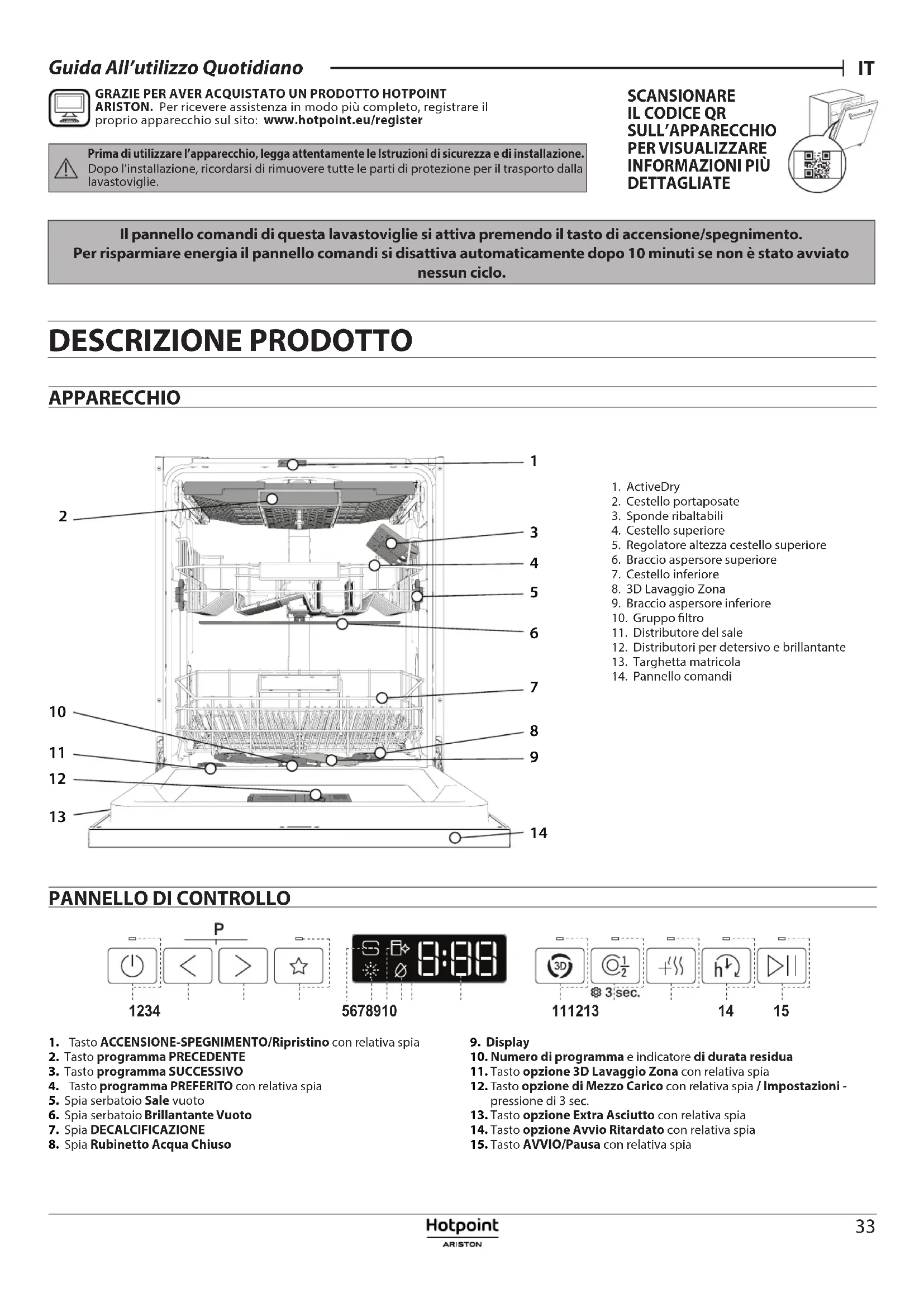 pressione di 3 sec.13. Tasto opzione Extra Asciutto con relativa spia14. Tasto opzione Avvio Ritardato con relativa spia15. Tasto AVVIO/Pausa con relativa spia1. ActiveDry2. Cestello portaposate3. Sponde ribaltabili4. Cestello superiore5. Regolatore altezza cestello superiore6. Braccio aspersore superiore7. Cestello inferiore8. 3D Lavaggio Zona9. Braccio aspersore inferiore10. Gruppo ltro11. Distributore del sale12. Distributori per detersivo ebrillantante13. Targhetta matricola14. Pannello comandi