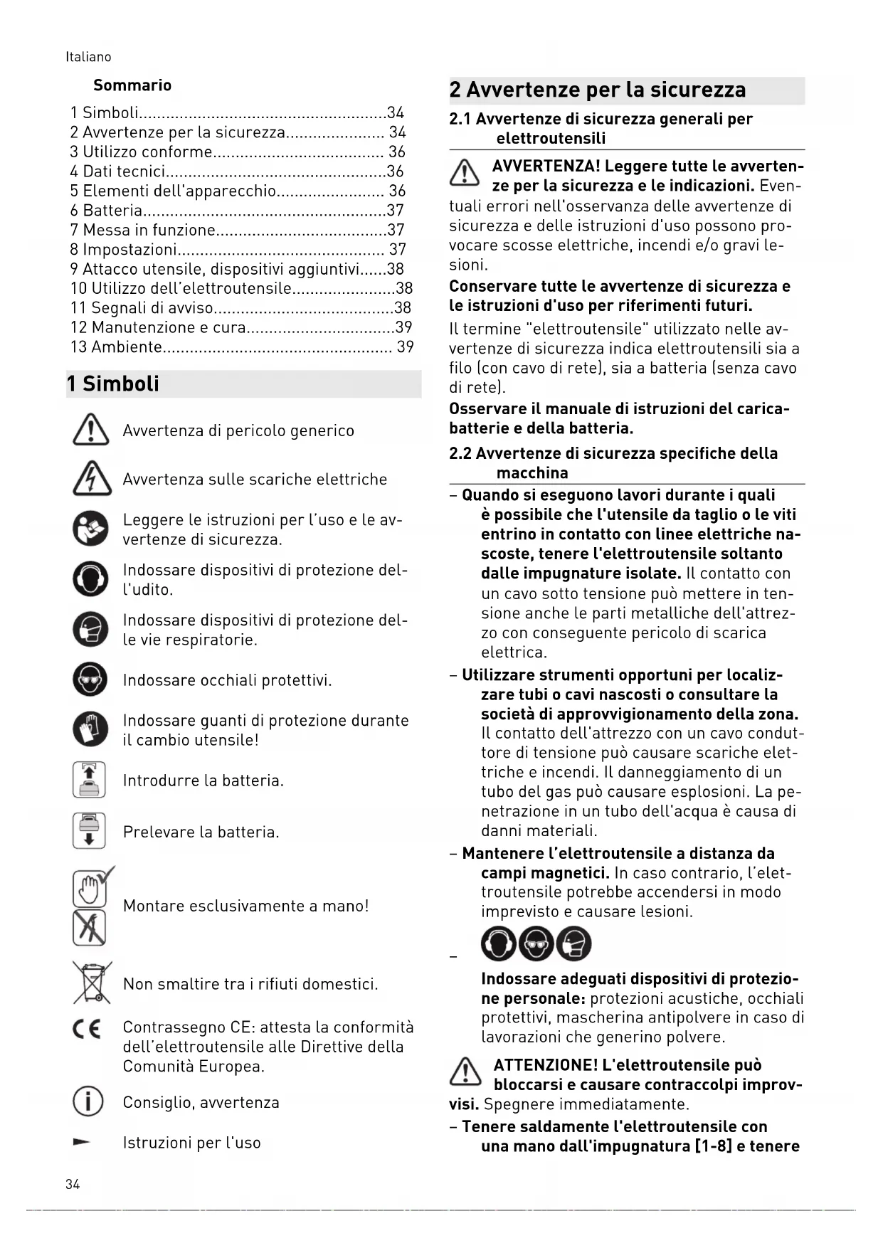 Indossare adeguati dispositivi di protezio ne personale: protezioni acustiche, occhiali protettivi, mascherina antipolvere in caso di lavorazioni che generino polvere. ATTENZIONE! L'elettroutensile può bloccarsi e causare contraccolpi improv visi. Spegnere immediatamente. – Tenere saldamente l'elettroutensile con una mano dall'impugnatura [1-8] e tenere Italiano 34l'altra mano lontano dalla zona di perico lo. Impostare correttamente il numero di giri per l’avvitamento. Tenersi preparati a un’elevata coppia di reazione, che può pro vocare una rotazione dell’elettroutensile e quindi causare lesioni. – Non utilizzare l'elettroutensile sotto la pioggia o in ambienti umidi. L'umidità nel l'elettroutensile può provocare cortocircui to e incendio. – Prima di smontarlo, aspettare che l'elet troutensile si sia arrestato. L'innesto del l'utensile può essere trascinato, causando la perdita di controllo dell'elettroutensile. – Evitare avviamenti involontari. Il trasporto dell'attrezzo elettrico con il dito appoggiato sull'interruttore ON/OFF può causare inci denti. Quando non si utilizza l'elettroutensi le, portare l'interruttore per il bloccaggio durante il trasporto [1-7] in posizione cen trale. – Non manomettere o bloccare elementi di comando come l'interruttore ON/OFF. – Per il funzionamento dell'utensile elettri co a batteria utilizzare solo le apposite batterie e nessun alimentatore. Non utiliz zare caricabatterie di fornitori terzi per caricare le batterie. L'uso di accessori non previsti dal costruttore può provocare scosse elettriche e/o gravi incidenti. – Avviso di radiazione luminosa nociva. Non guardare a lungo il fascio luminoso. Non orientare il fascio luminoso verso al tre persone o animali. La radiazione lumi nosa può causare danni oculari - [4]. – In caso di lavorazioni che generino polvere, utilizzare un sistema di aspirazione. – Non utilizzare utensili in dotazione e ac cessori che non siano espressamente pre visti e consigliati dal produttore per il pre sente elettroutensile. Il solo fatto che l'ac cessorio o l’utensile della dotazione si pos sa fissare sull’elettroutensile non significa che lo si possa utilizzare in sicurezza. Il ri schio di lesioni e l'usura dell'elettroutensi le possono aumentare e la qualità dei risul tati di lavoro può peggiorare. – A seconda del tipo e dell'uso degli acces sori, particelle, utensili della dotazione e parti possono staccarsi dall'utensile. Pos sono aumentare l'esposizione alla polvere e i movimenti imprevisti. Indossare i di spositivi di protezione individuale adeguati. Tenersi preparati ad un’elevata coppia di reazione, che può provocare una rotazione dell’elettroutensile e conseguenti lesioni.